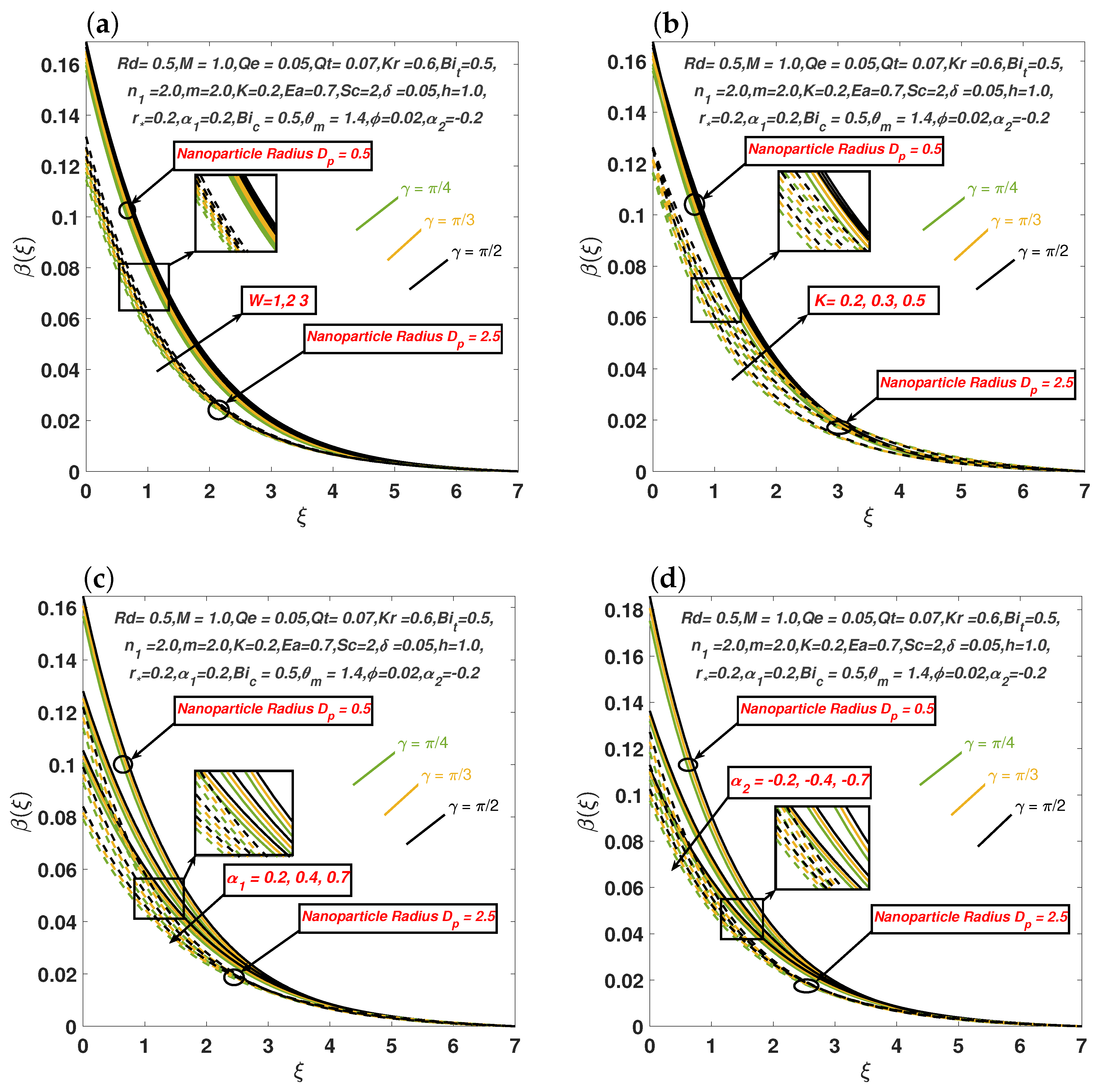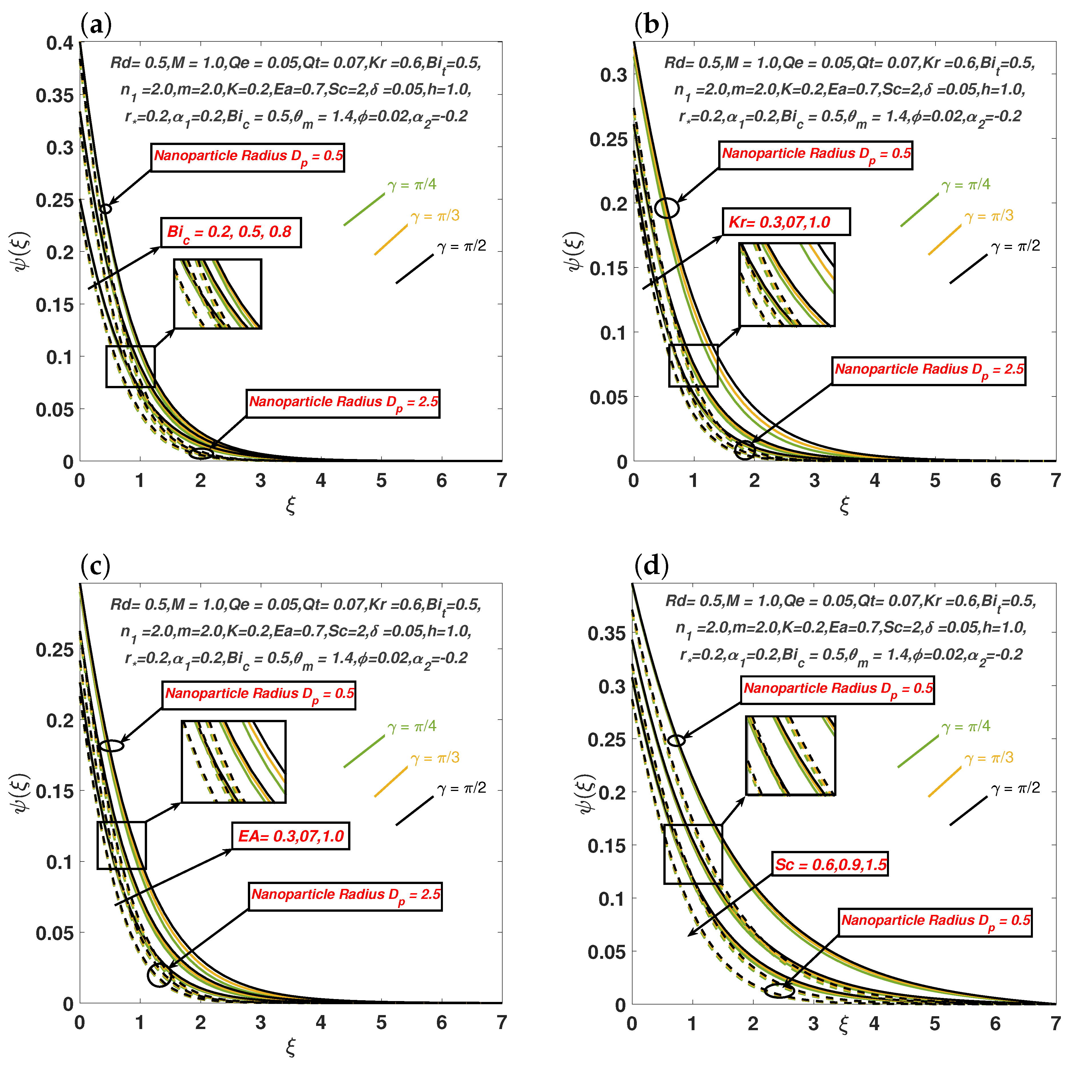 Figure 5a,b illustrate how the concentration Biot number, chemical-reaction parameter K r , nanoparticle radius D p , and the stimulating influence of inclined MHD affect the concentration profile. The relationship between the Schmidt number ( S c ) and the activation-energy parameter ( E a ) with the concentration profile is shown in Figure 5c,d. The E a increases the profile, while a notable decrease is observed with S c . Physically, the activation-energy parameter provides atoms or molecules with greater energy to interact, thereby intensifying the chemical reaction and enhancing the concentration profile.