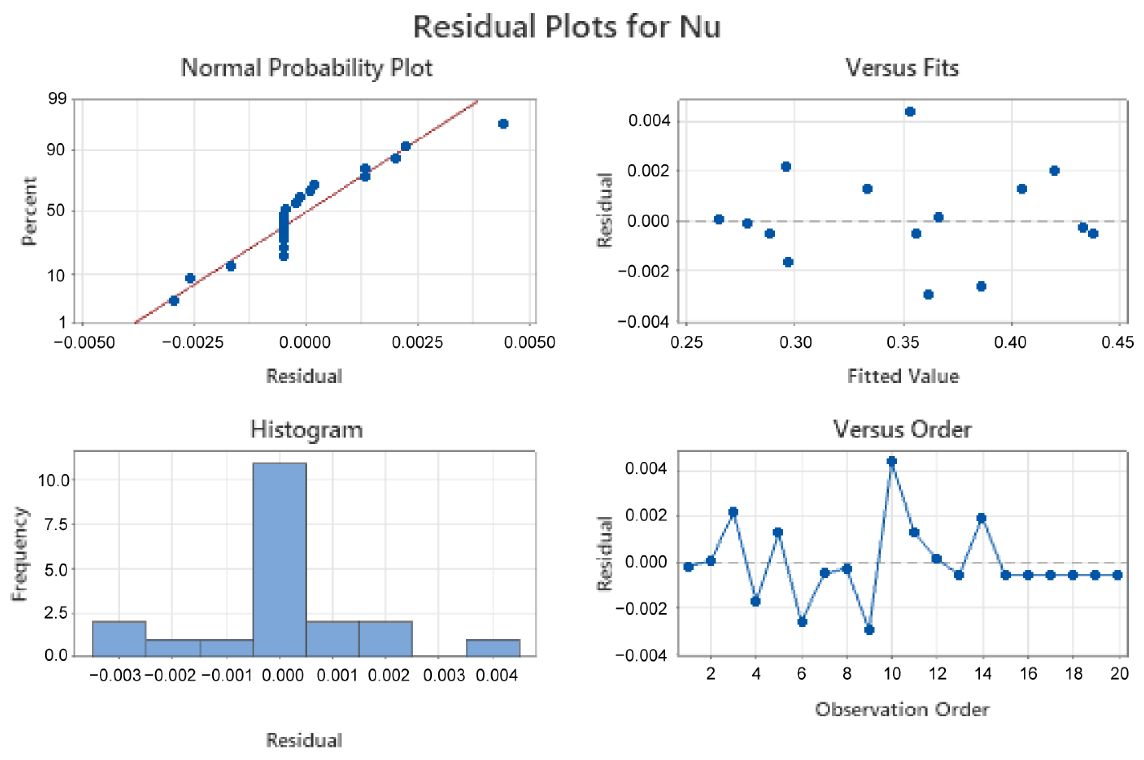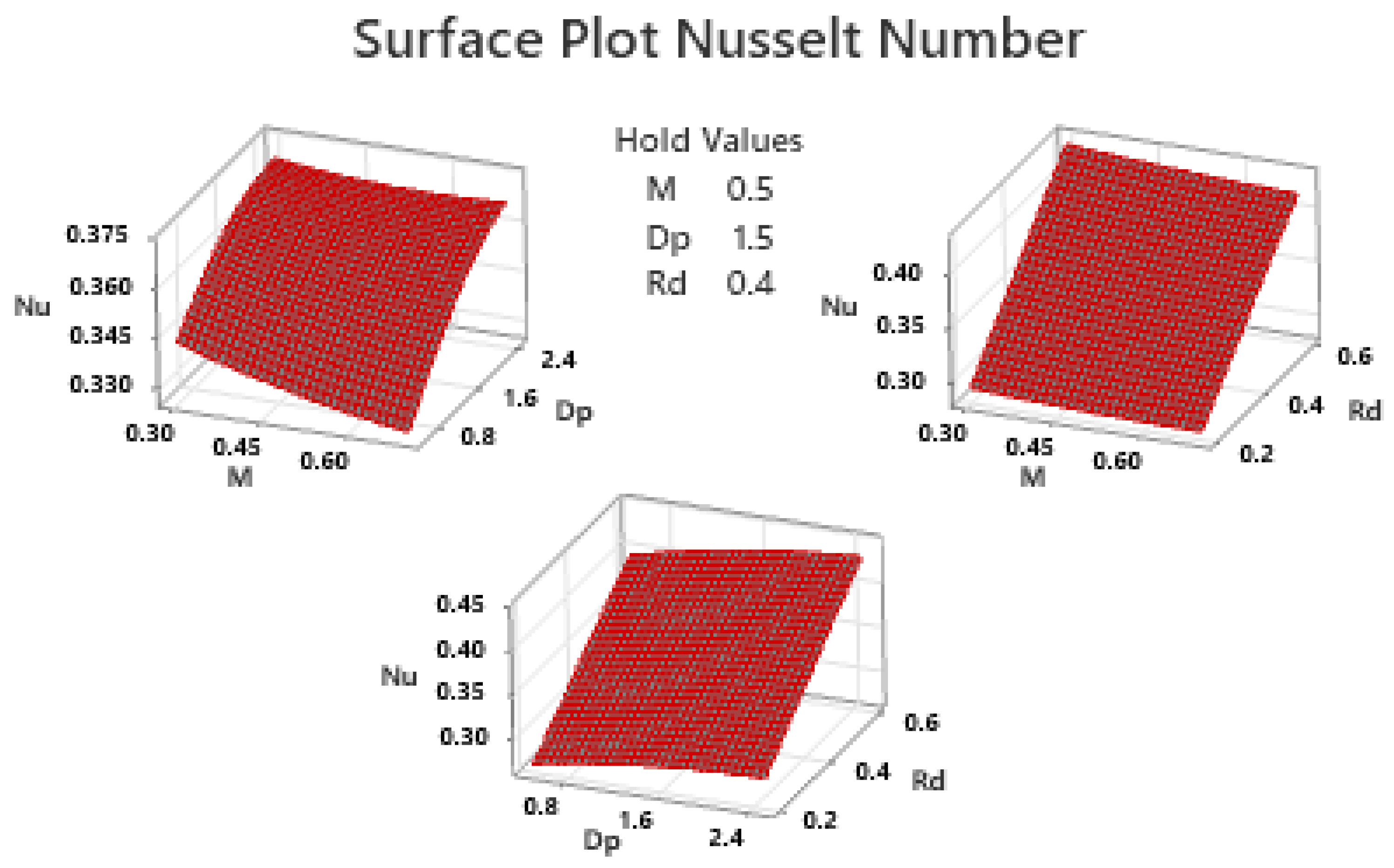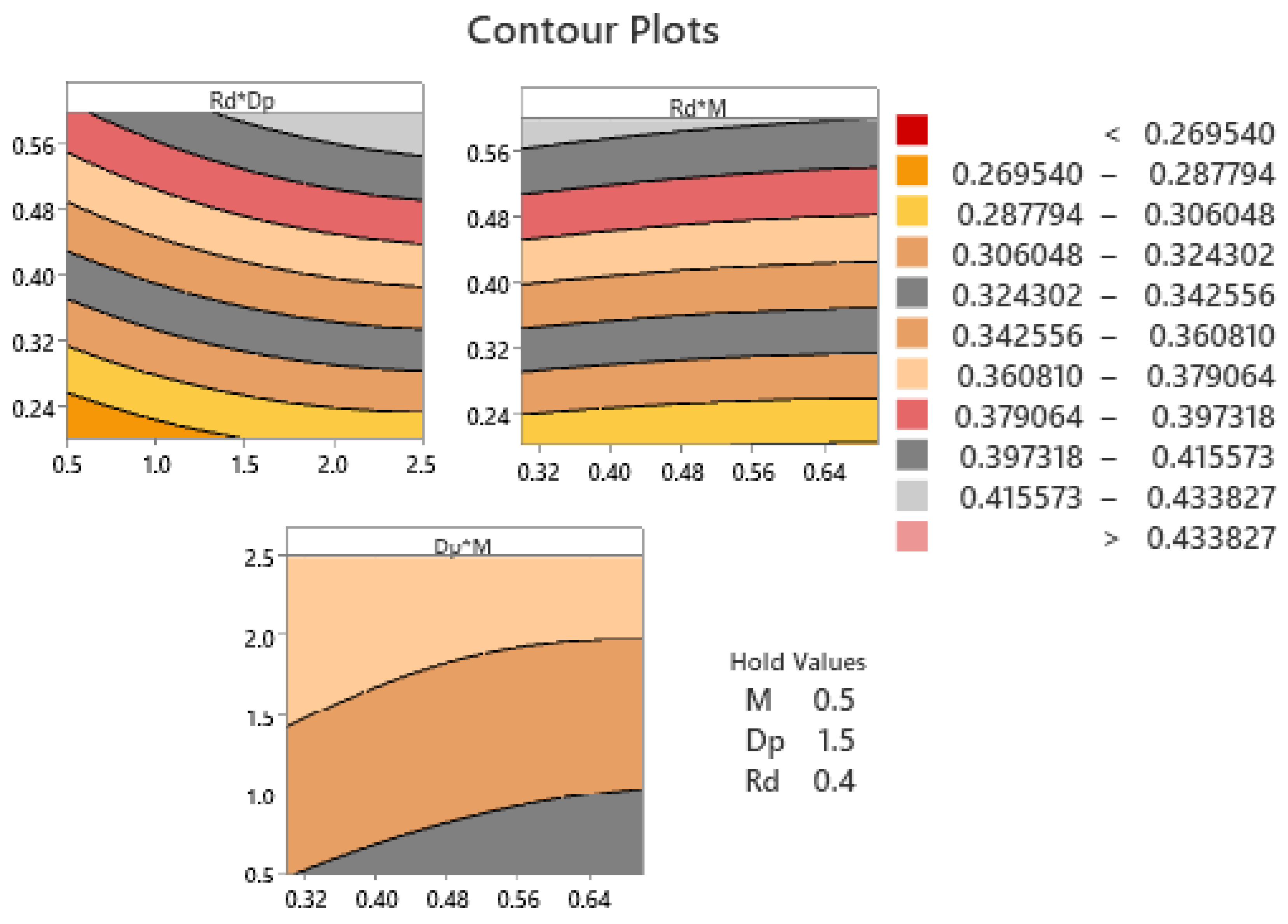 The estimated model’s efficiency is detailed in the ANOVA table (Table 7). A parameter is deemed significant if its associated p-value is less than 0.05 and its related F-value is larger than 1. See Areekara et al. [43]. The quadratic terms in M and D p , as well as the interaction term M D p , are found to be meaningless. These terms are, therefore, removed from the model. With a coefficient of determination ( R 2 ) of 99.96, the model’s accuracy is increased. The uncoded version of the fitted quadratic model for N u x / R e x is provided by