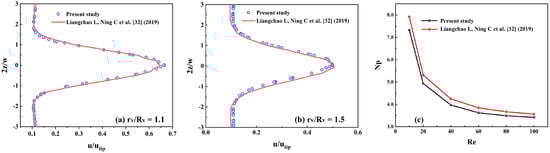 Comparison of the simulation model with experimental data in the literature []. (a,b) Dimensionless velocity distribution at different positions. (c) Variation in power parity at different Reynolds numbers.