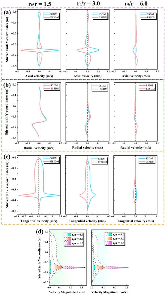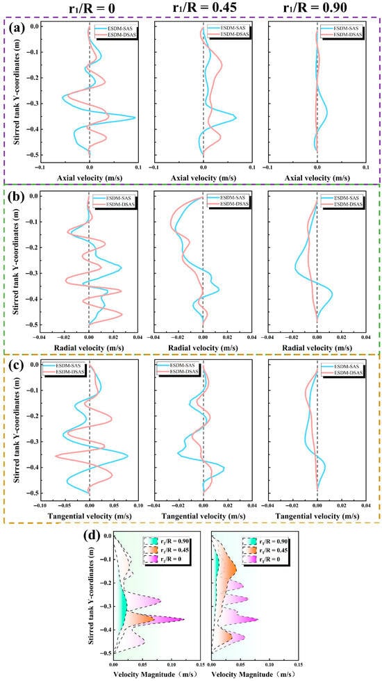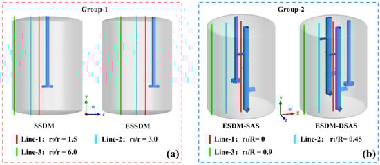 In order to investigate the spatial position and structure of different stirring impellers on the flow field distribution and mixing degree in the stirring tank, this study divides the four stirring kettles into two groups, and the specific grouping and analyzing methods are shown in Figure 7. The first group is a single-axis group, covering single serrated dispersing mixing kettle and eccentric serrated dispersing mixing kettle, for which the speeds in the three axial directions at the distances of r0/r = 1.5, 3.0 and 6.0 from the impeller are selected for analysis (r0 represents the distance from the center of the stirring shaft to the position where this value is located); the second group is a multi-axis group, including two kinds of mixing kettles, namely, ESDM-SAS and ESDM-DSAS, for which the mixing kettle positions are selected as r1/R = 0, 0.45 and 0.9 (r1 represents the distance from the center of the mixing tank to the location of the measured value). For this group, the velocities in the three axial directions were analyzed at the stirring kettle positions of r1/R = 0, 0.45, and 0.9.