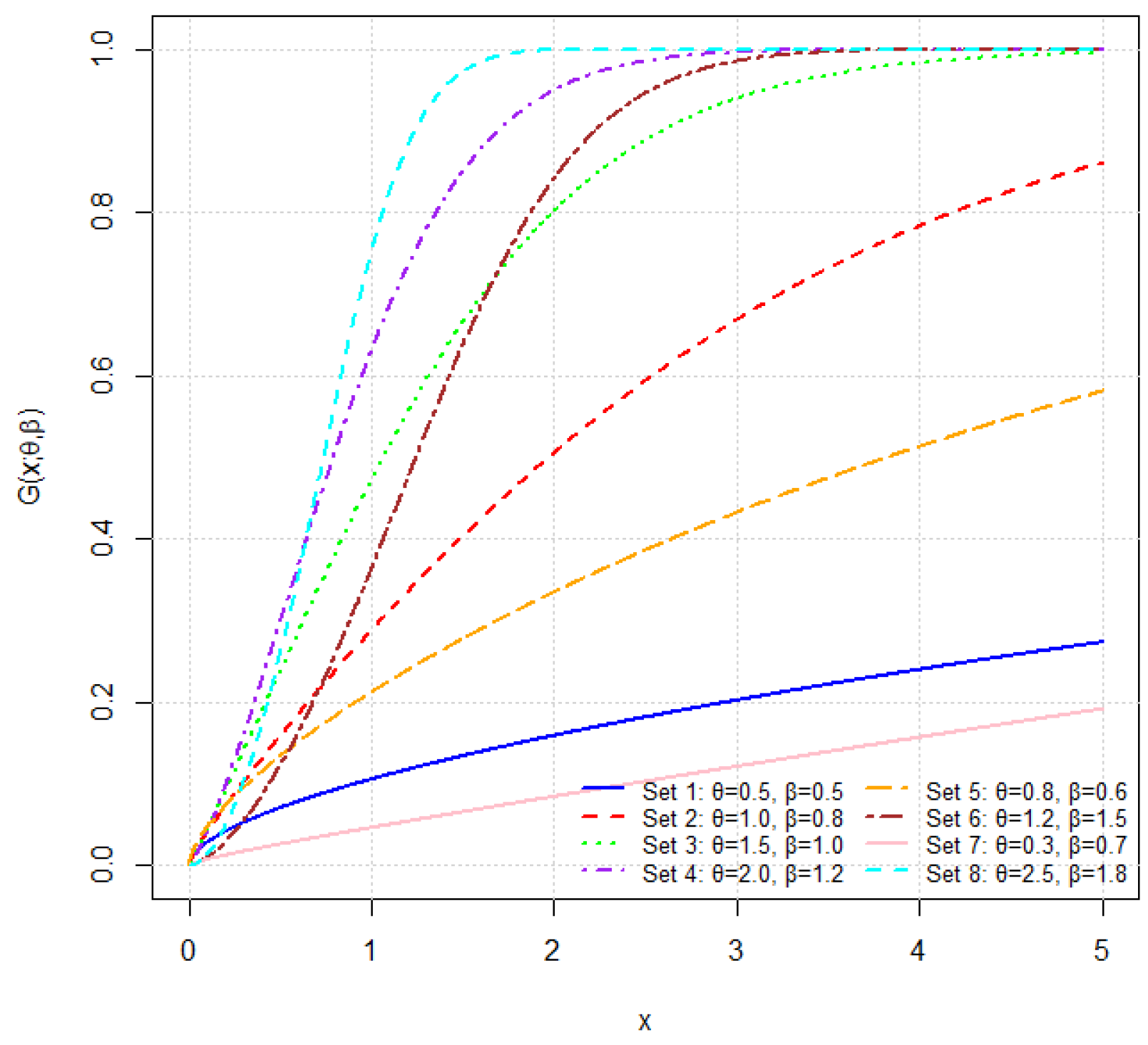 CDF of the THLGPL distribution for various parameter combinations. The curves demonstrate how jointly influence the distribution’s growth pattern and tail characteristics.