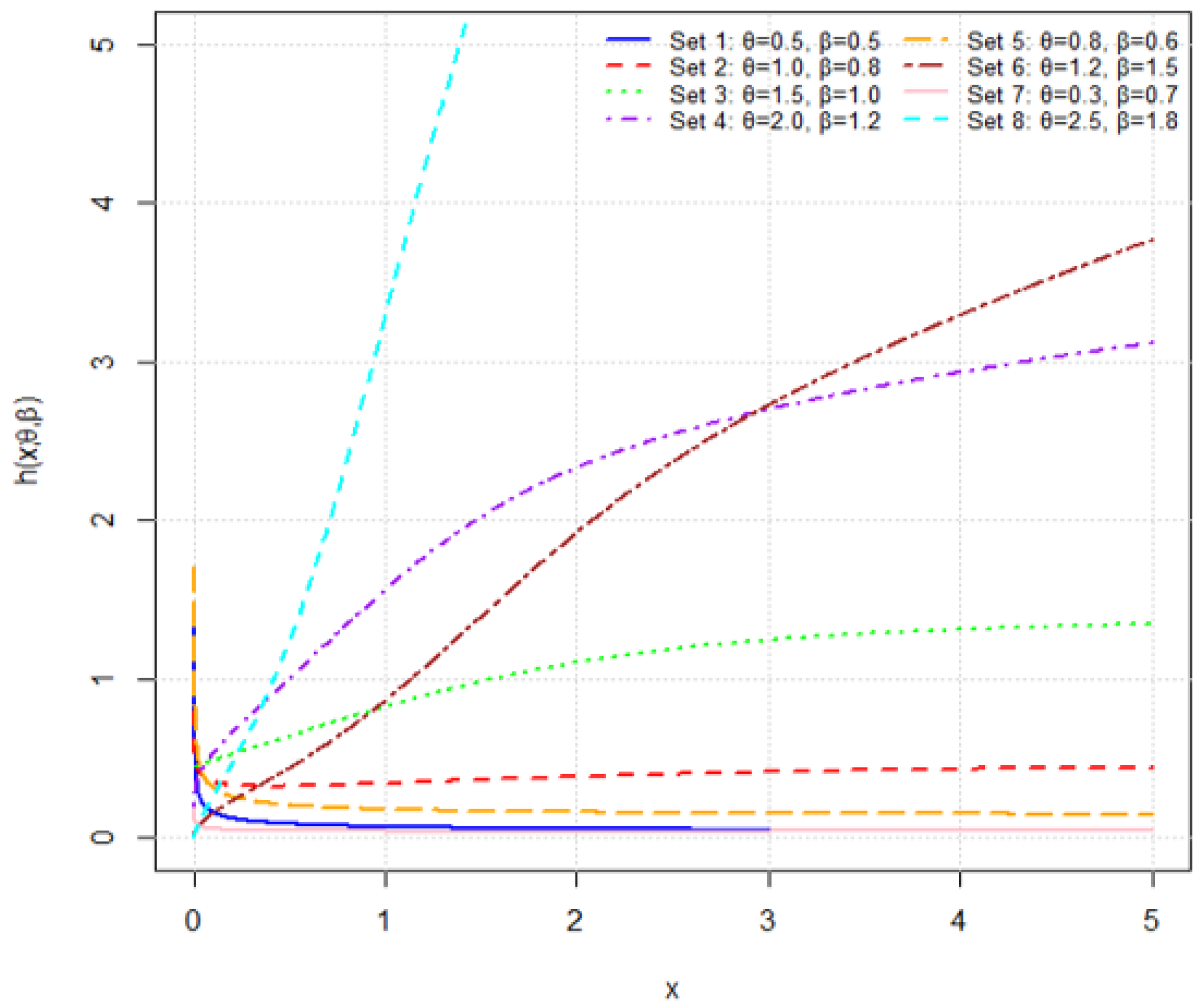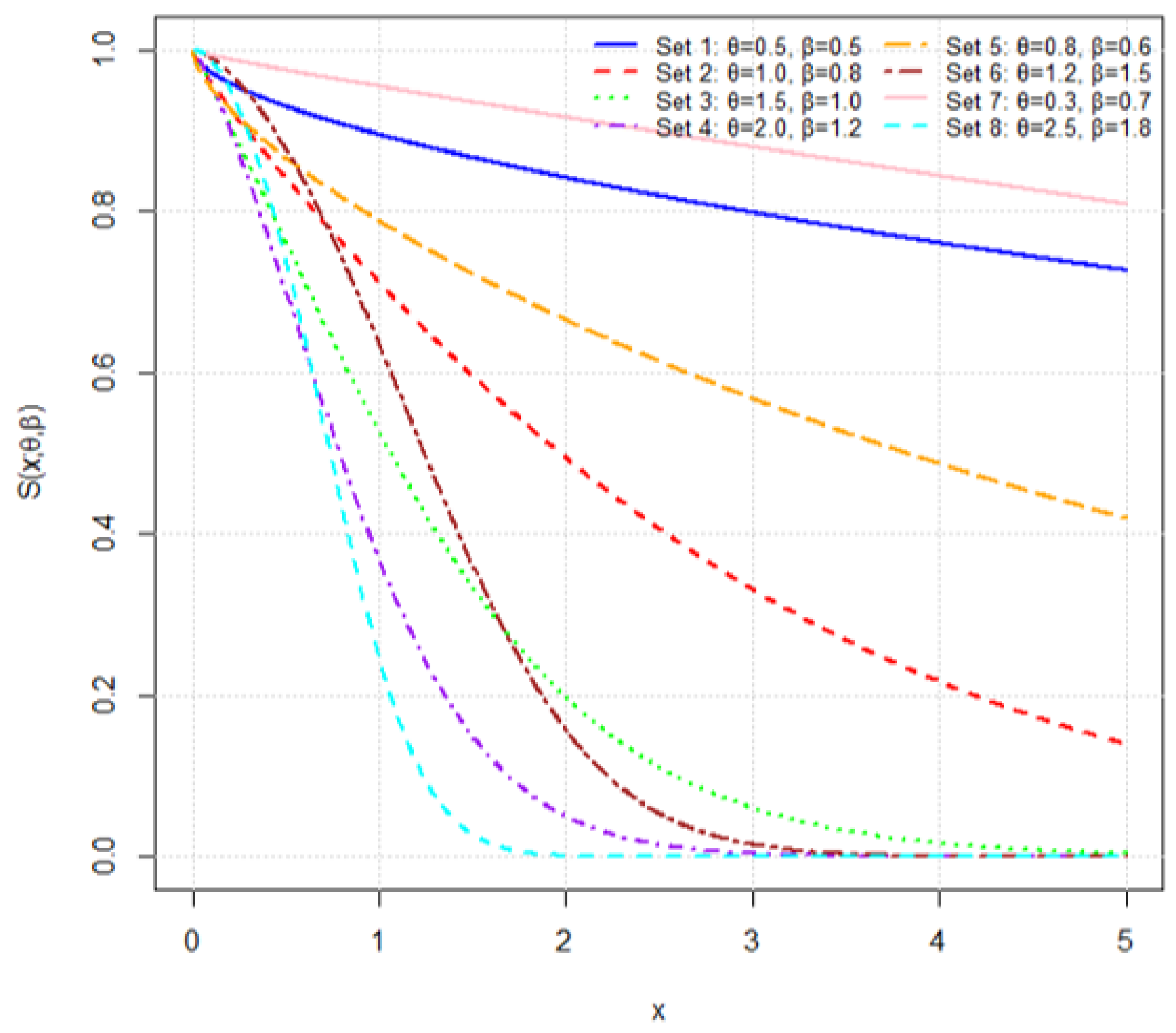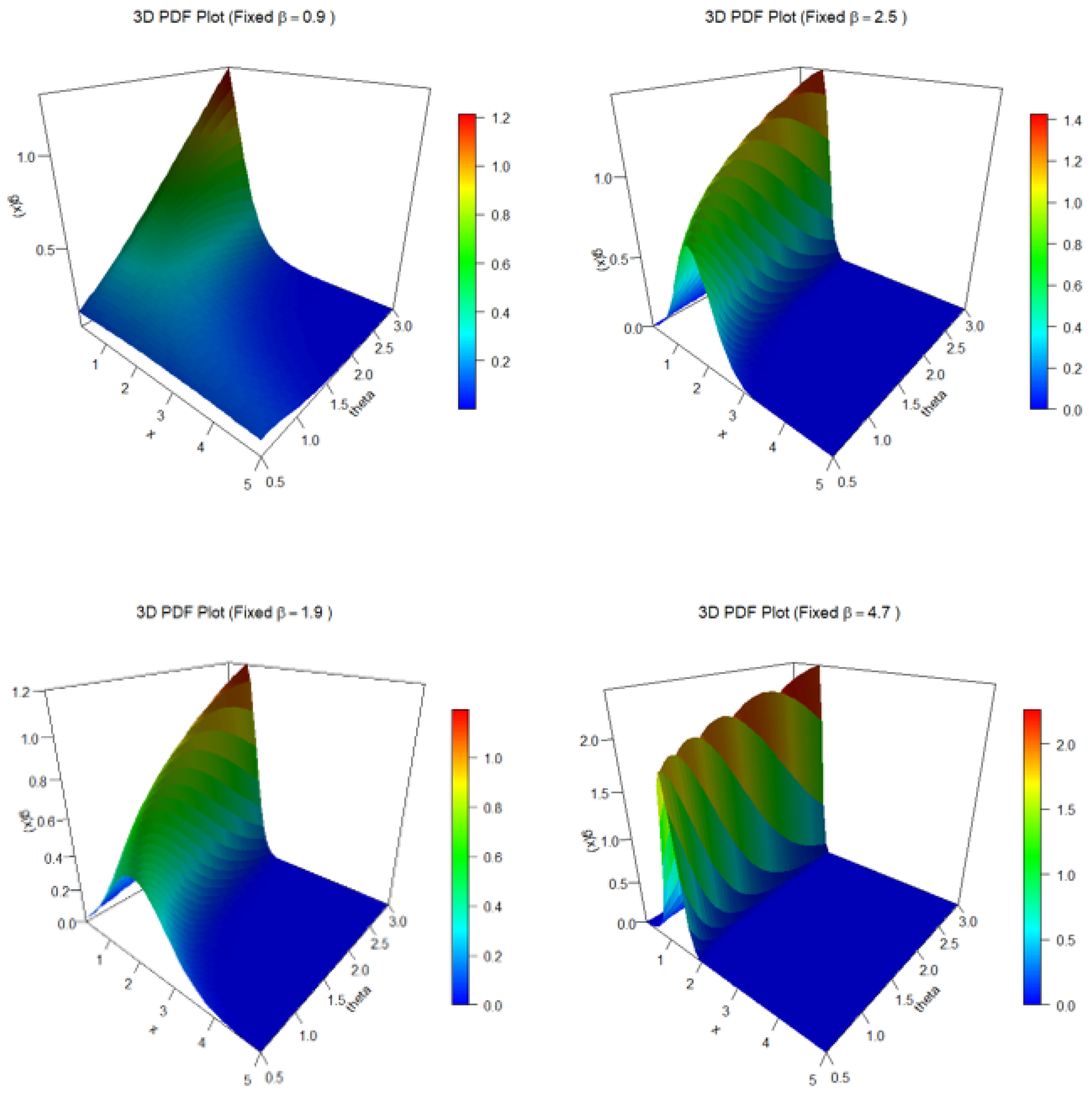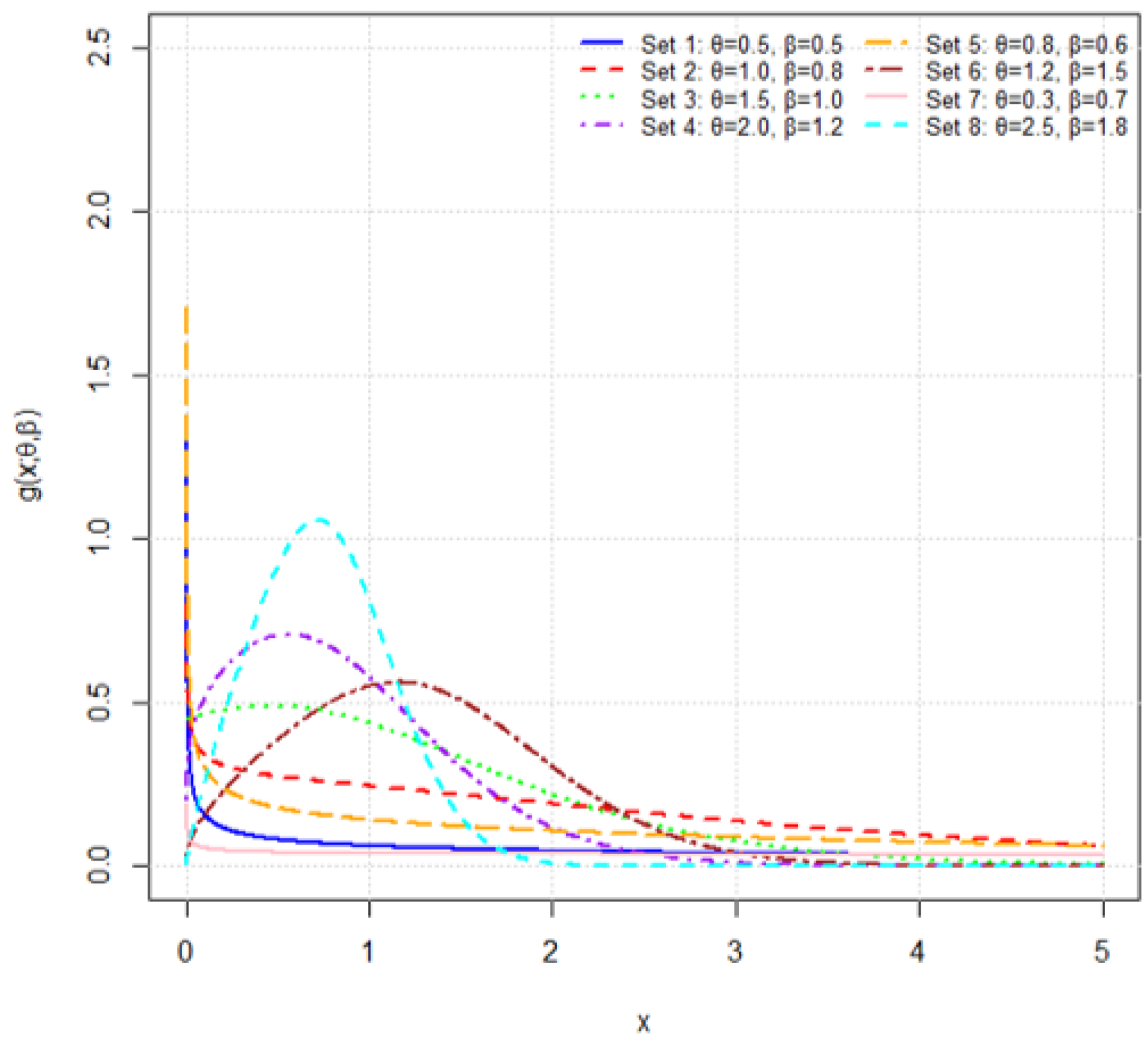 Plots of the PDF for several parameter combinations. The figure illustrates how different values of and affect the peak, spread, and tail behavior of the density.
