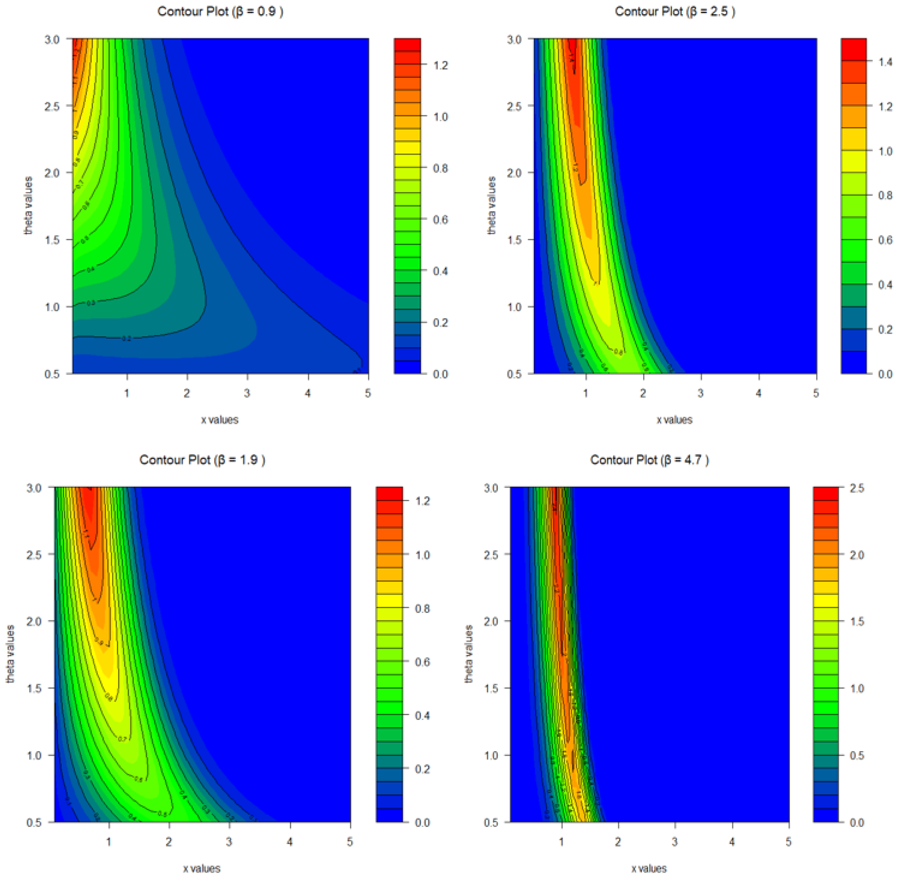 Contour plots of the THLGPL PDF for several fixed values of . The contour lines illustrate how the joint behavior of and x affects the shape and concentration of the density.