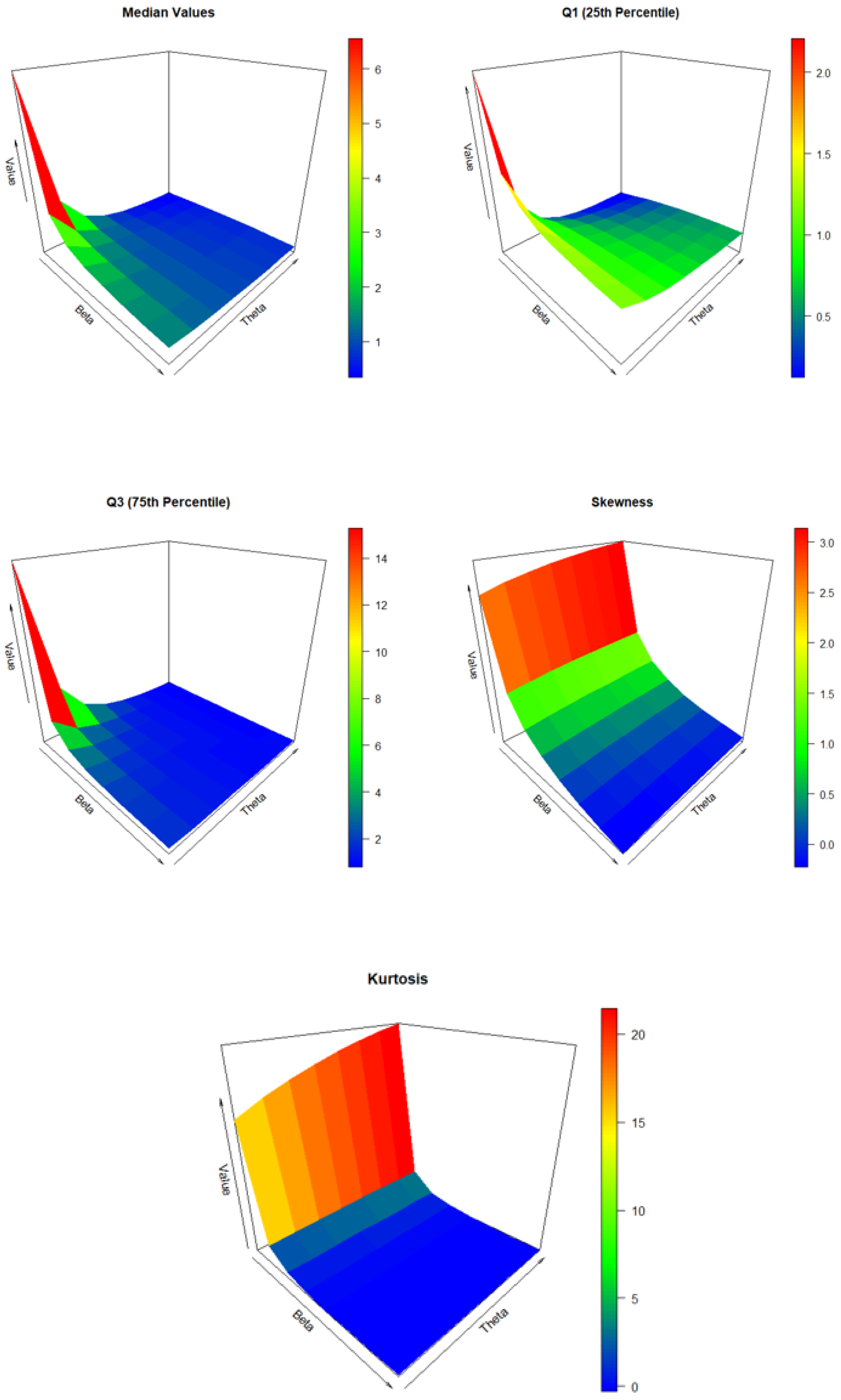 Plots of the median, , , Bowley’s skewness , and kurtosis across selected .
