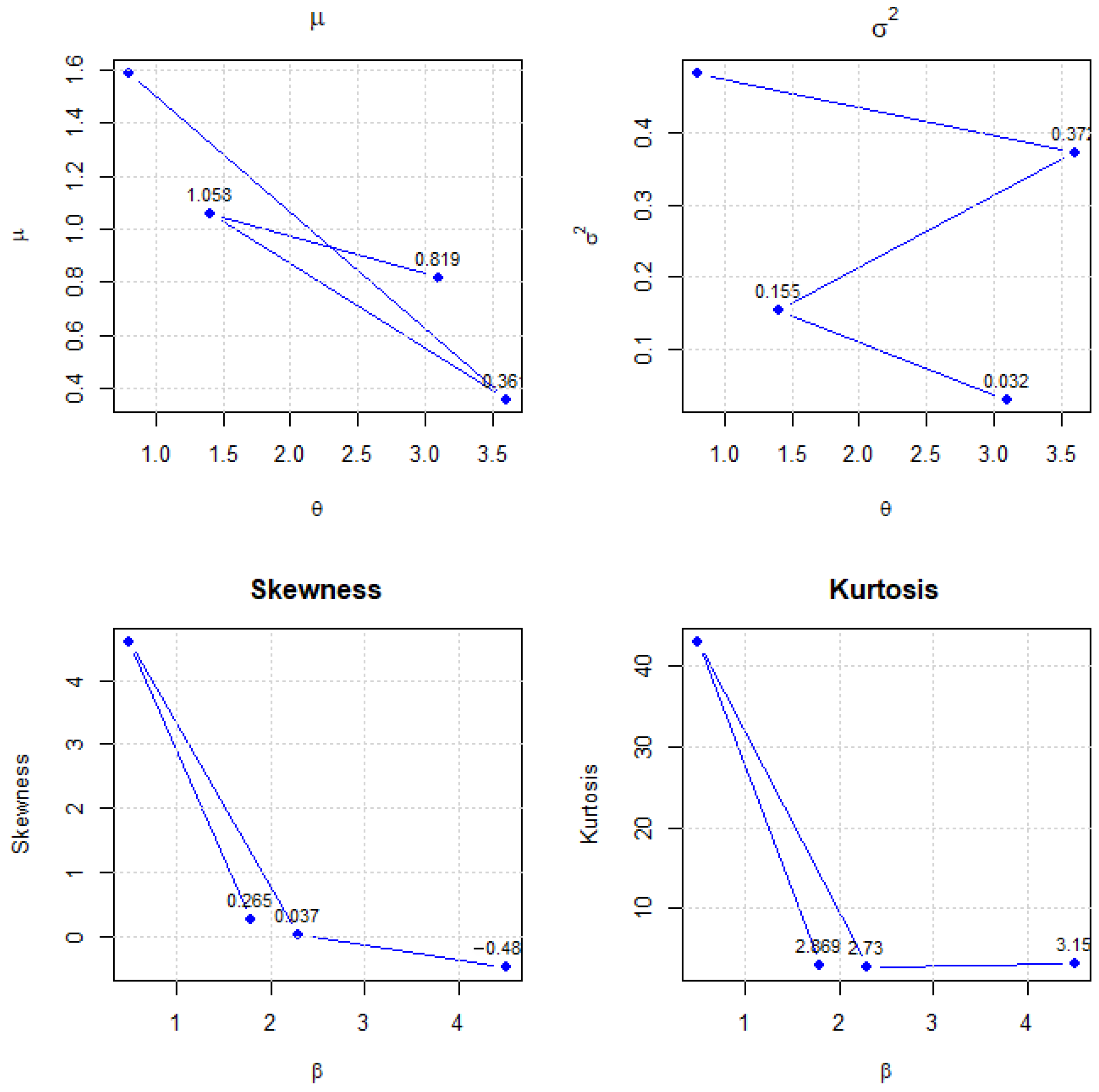 Plots of the first four moments (, , skewness, kurtosis) of the THLGPL distribution for selected parameter combinations . The figure illustrates how central tendency, dispersion, and shape characteristics vary with changes in and .