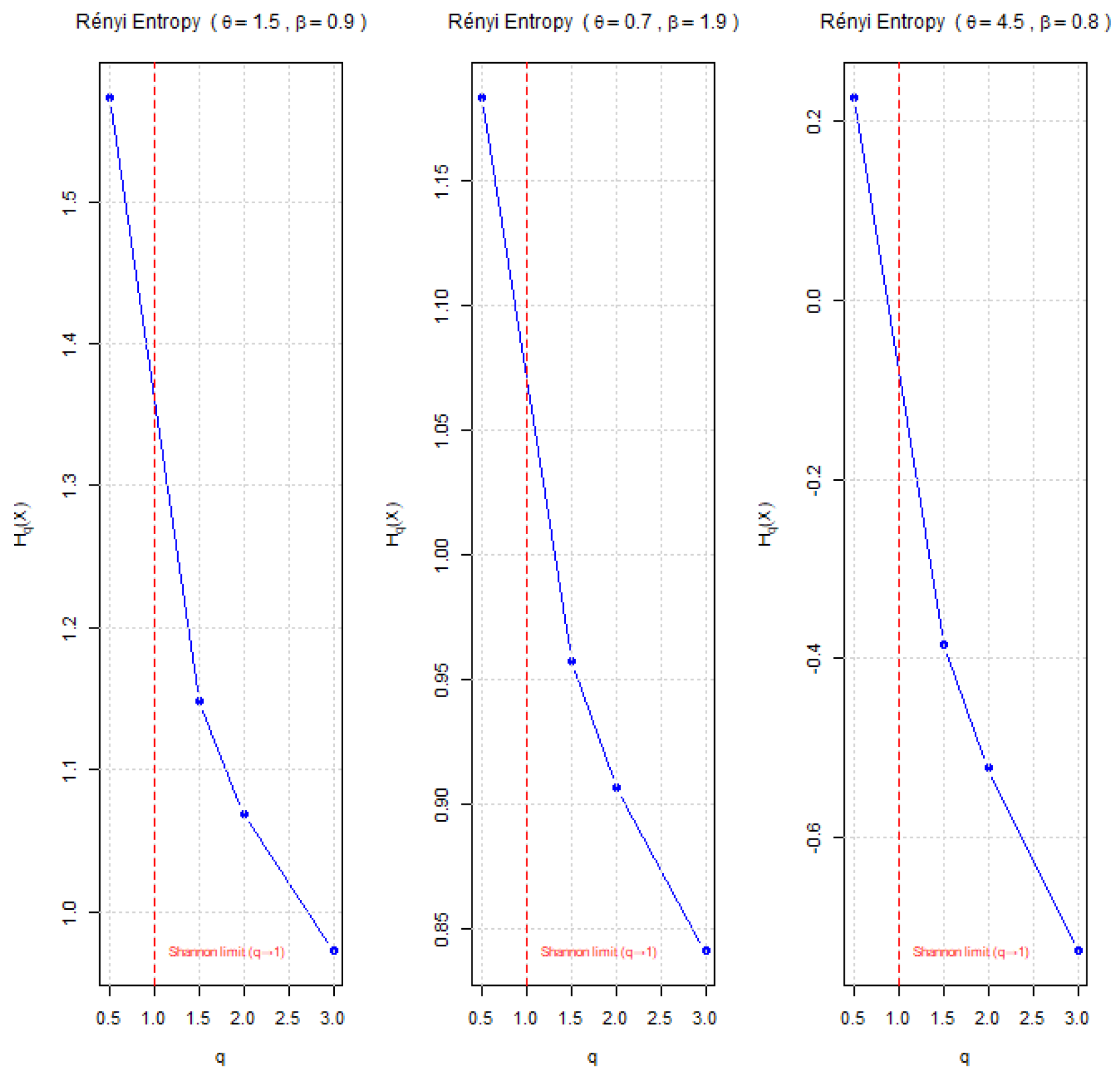 Plots of the Rényi entropy for the THLGPL distribution under different parameter combinations . The vertical red dashed line denotes the Shannon entropy limit at .