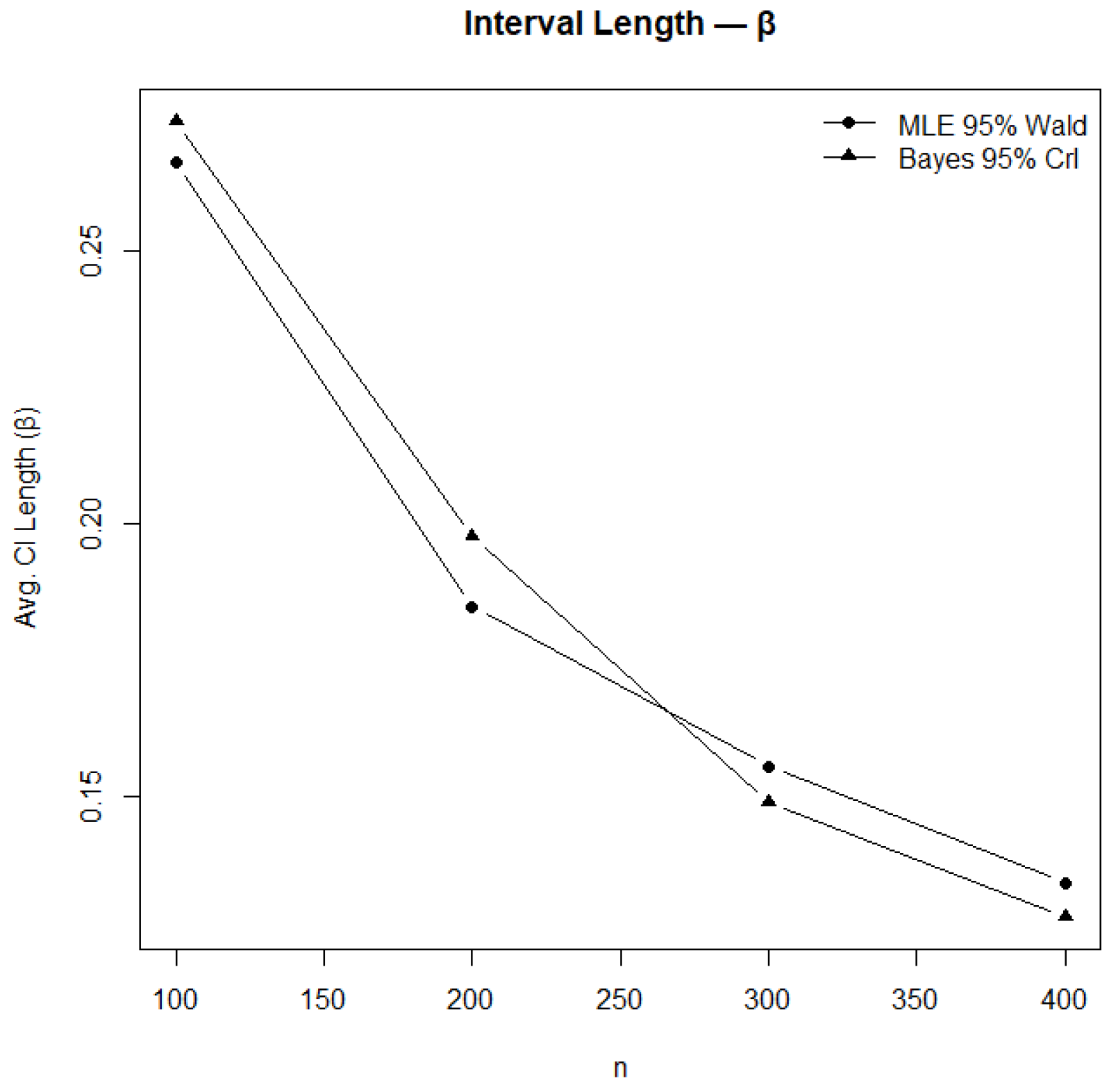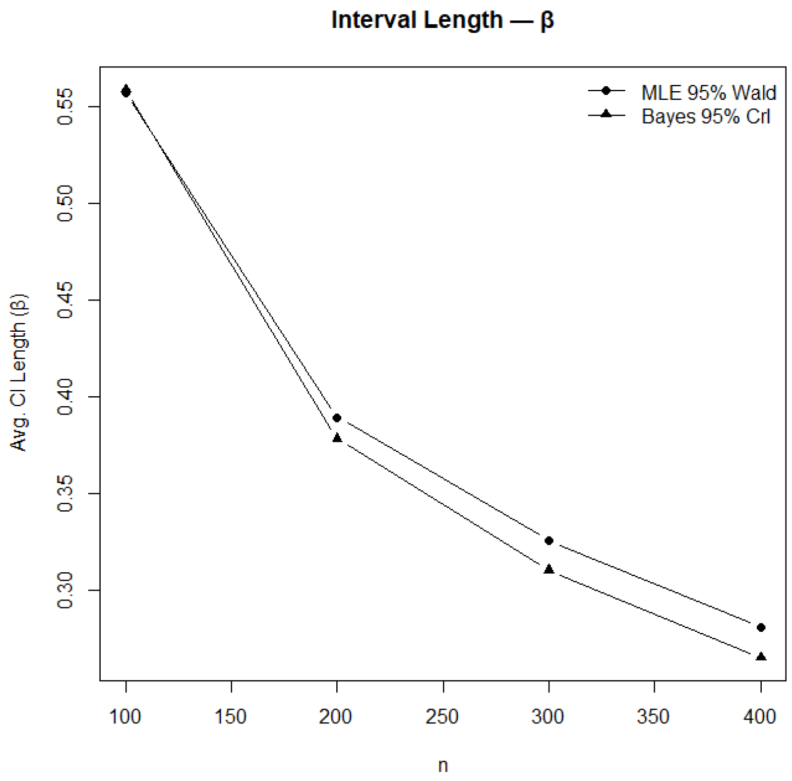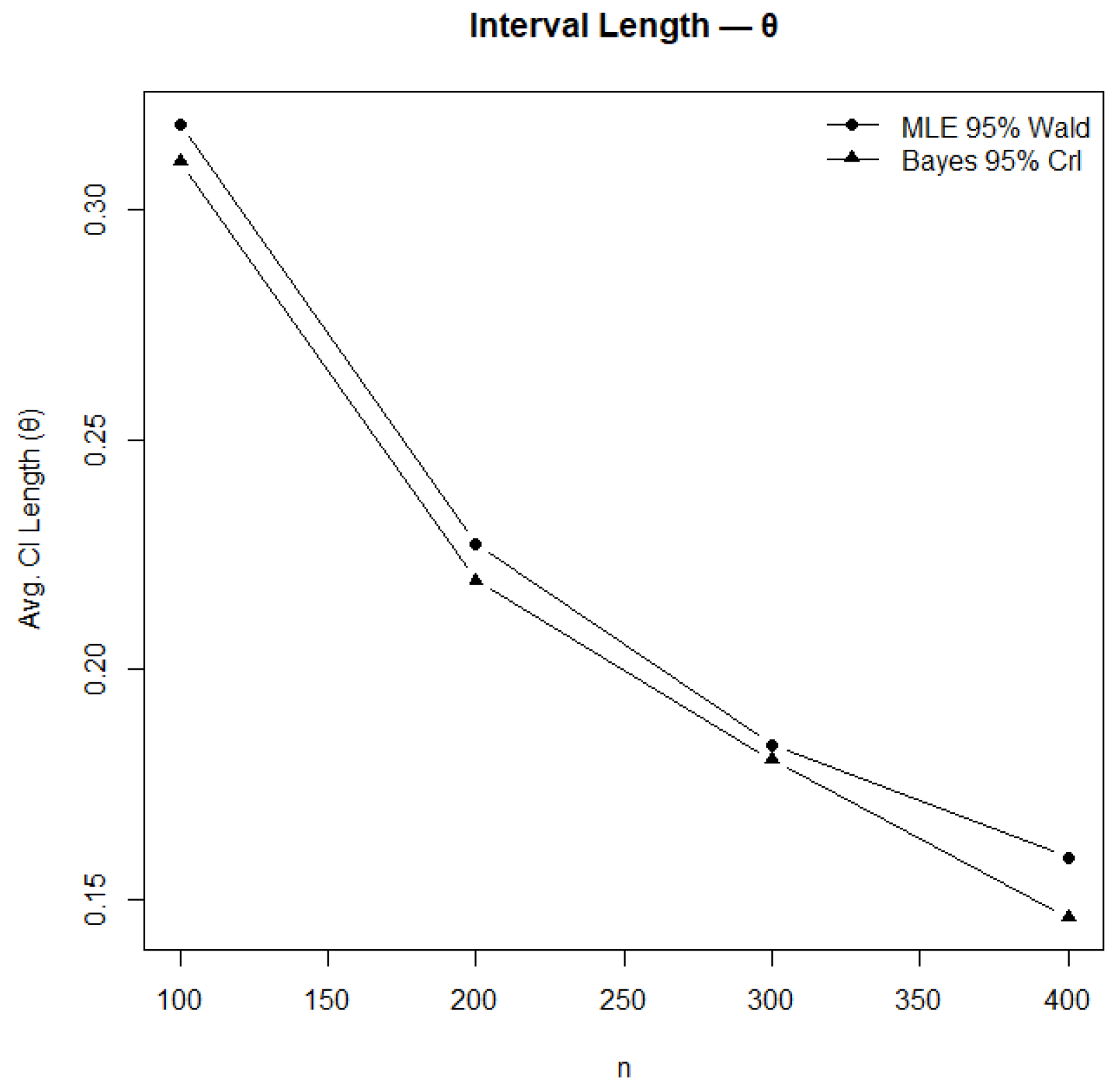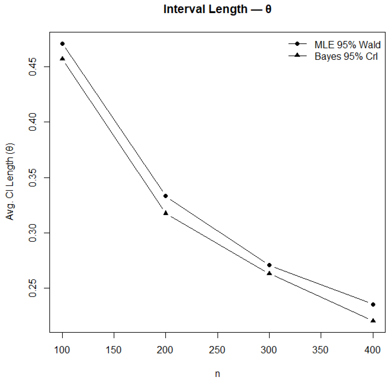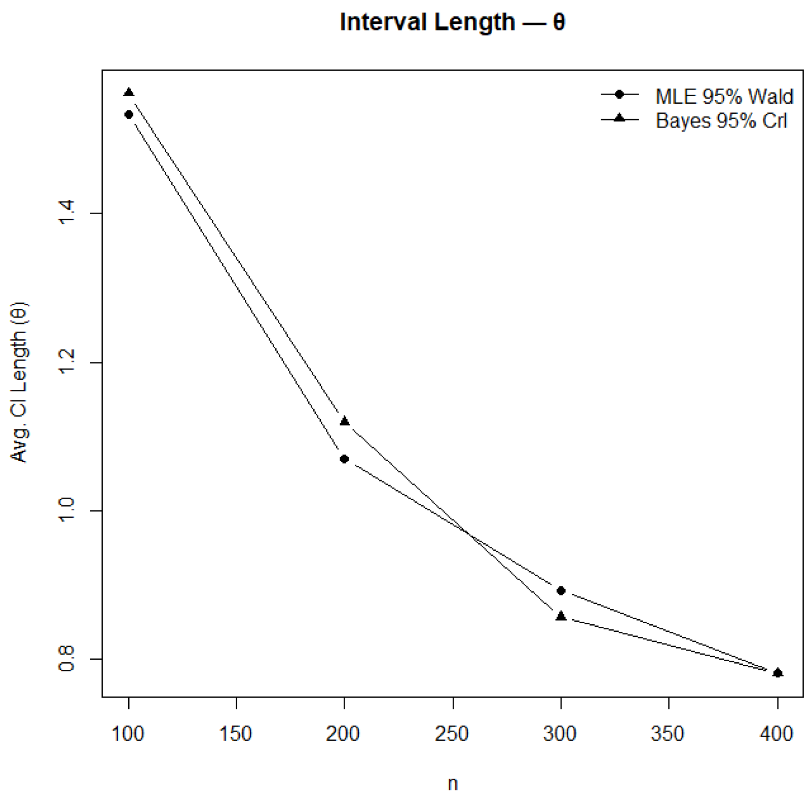 Comparison of confidence and credible interval lengths between MLE and Bayesian inference for .