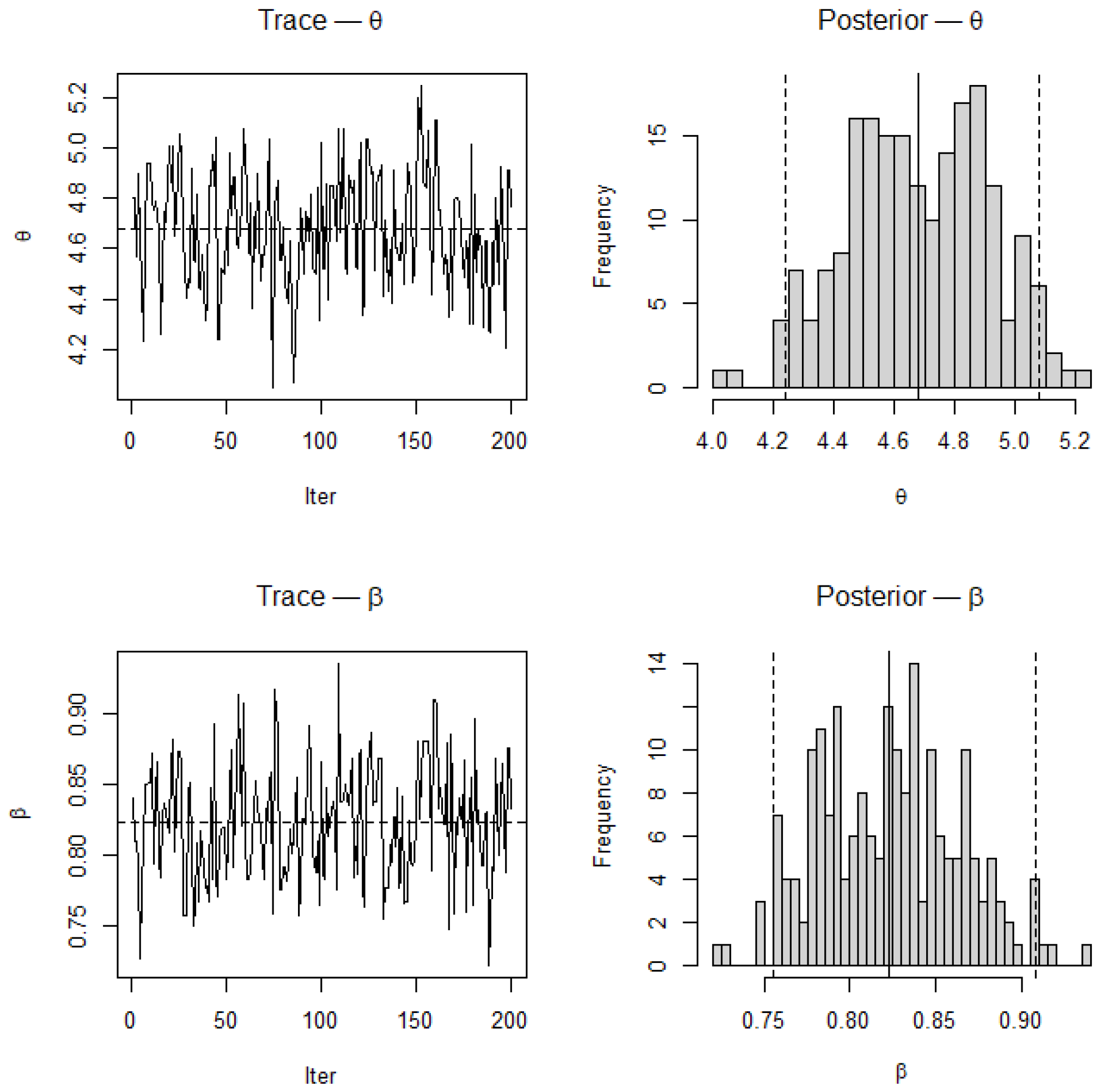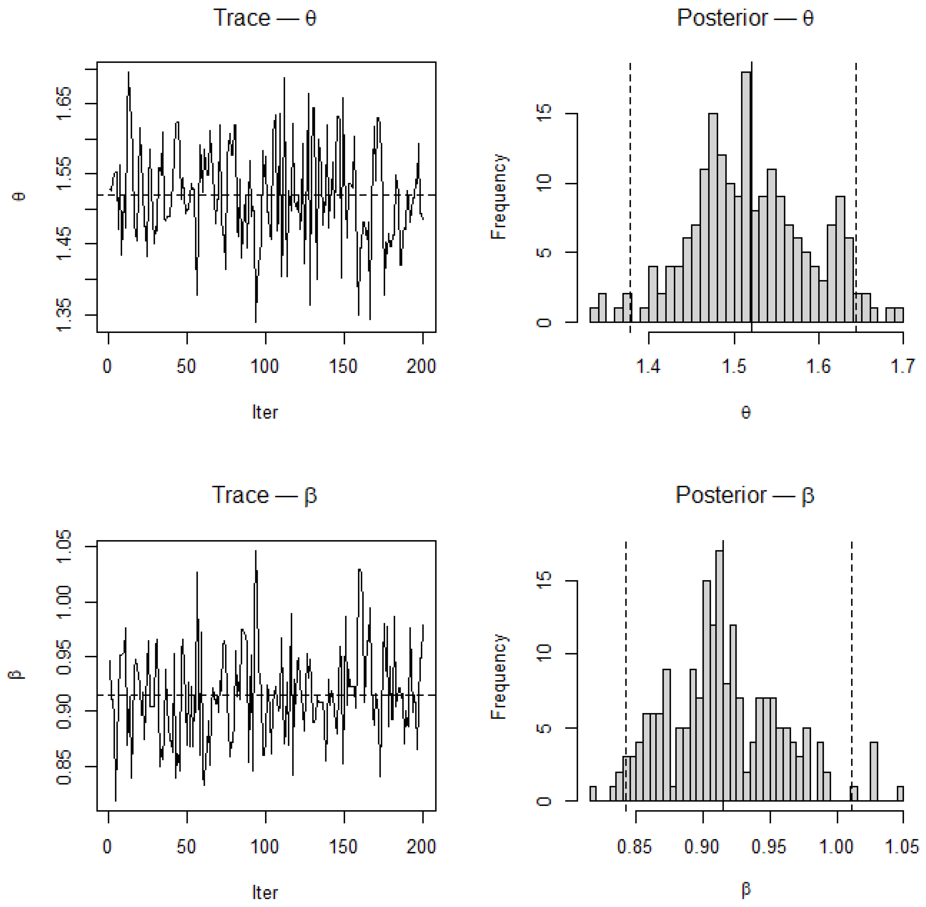 Trace plots and posterior density plots for and based on MCMC samples for . Trace plots exhibit good mixing and stationarity, while posterior densities are unimodal and symmetric, confirming convergence and stability of the Bayesian estimation.