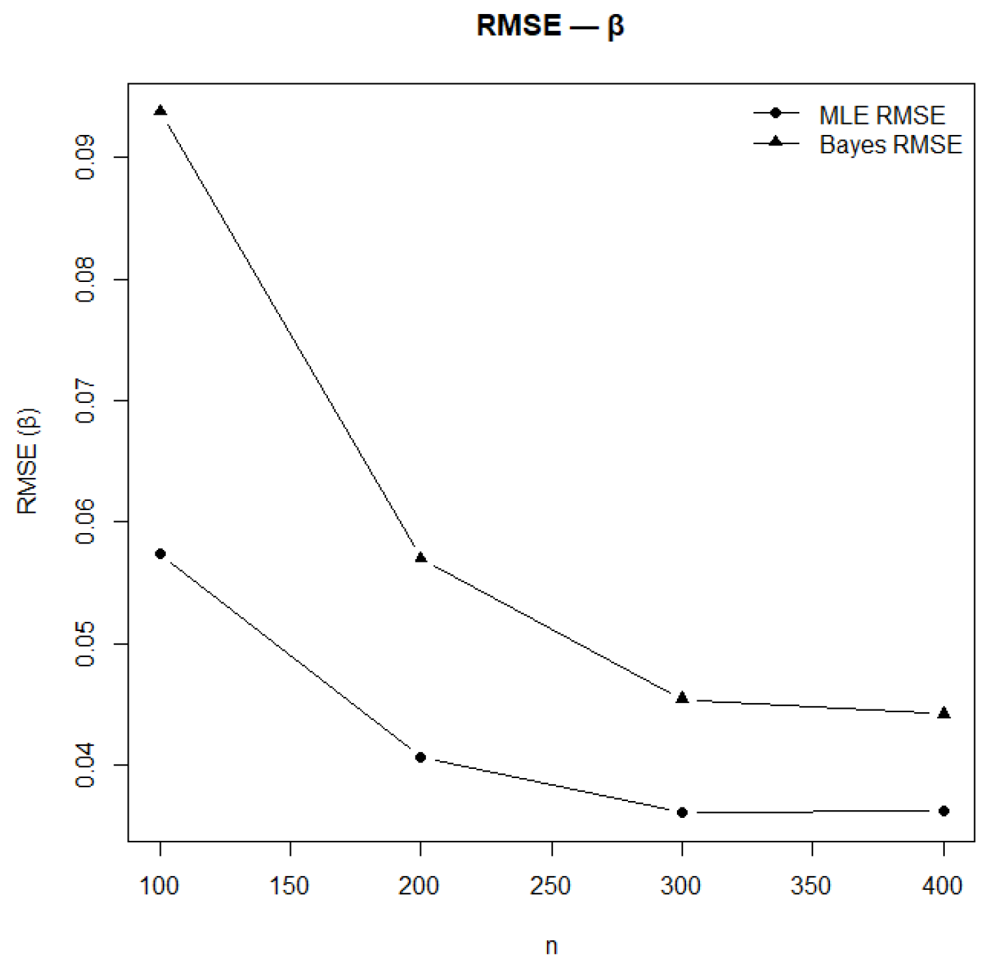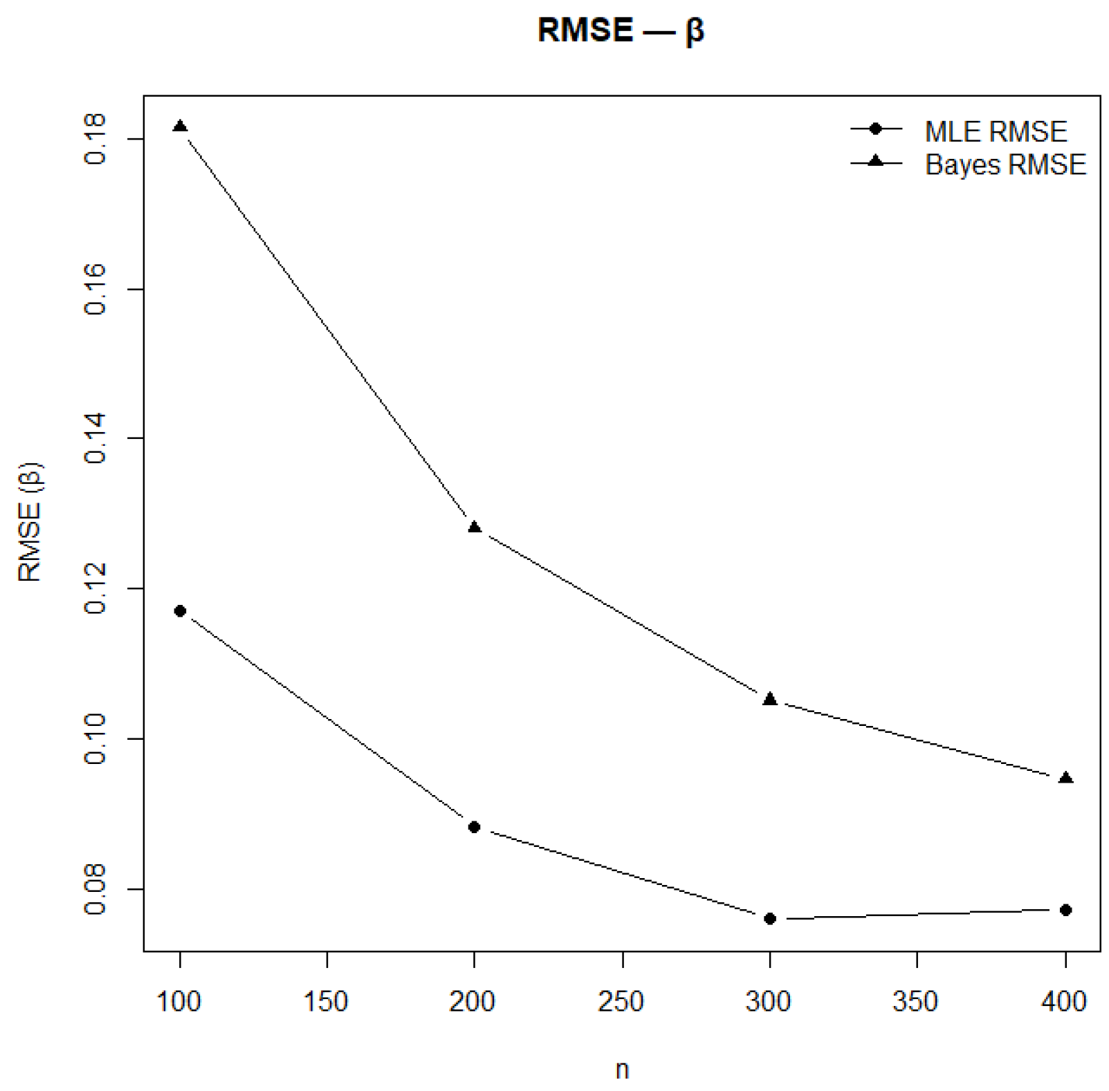 Comparison of interval lengths obtained by MLE and Bayesian inference for .