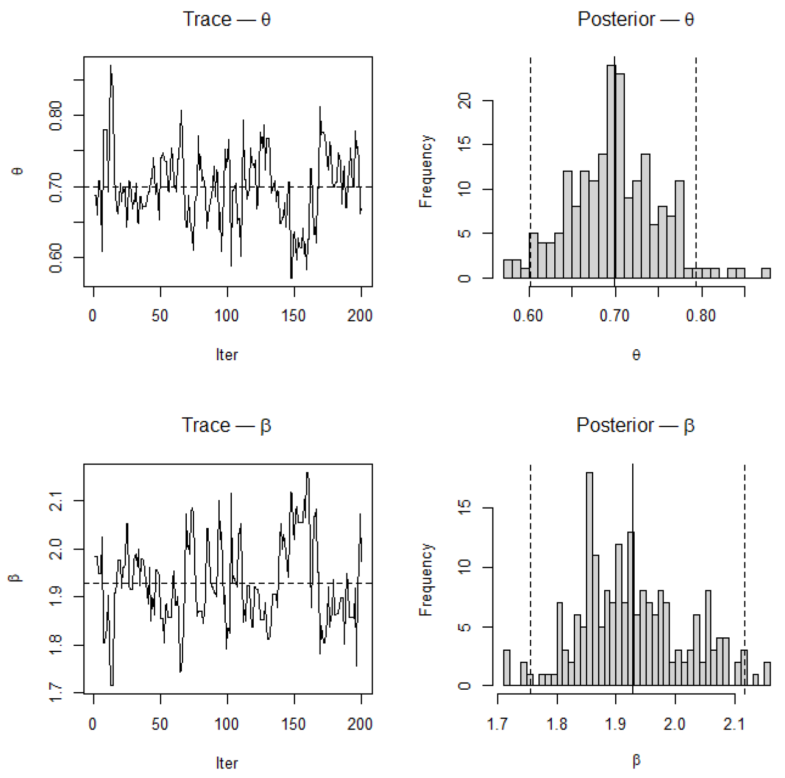 Trace and posterior density plots for and based on MCMC samples for . Dashed vertical lines represent posterior means and true parameter values used for simulation. Trace plots display good mixing and stationarity, while the posterior densities are unimodal and symmetric, confirming MCMC convergence and parameter stability.