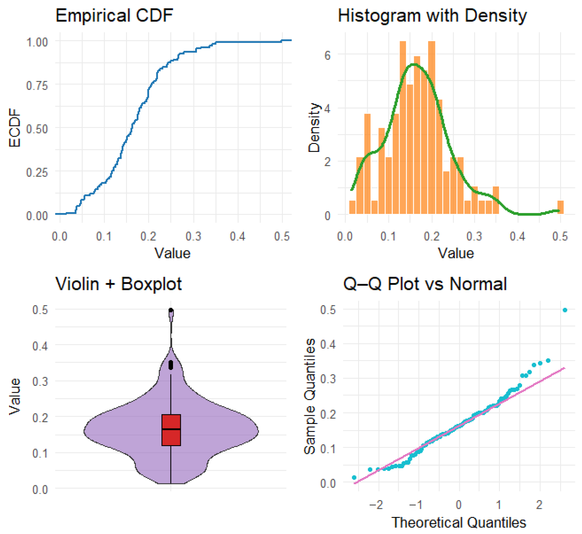 Exploratory plots for the trade share data, including: empirical cumulative distribution function (blue), histogram with overlaid kernel density estimate (red), violin and boxplot representation (green), and Q–Q plot points against the normal distribution (black).