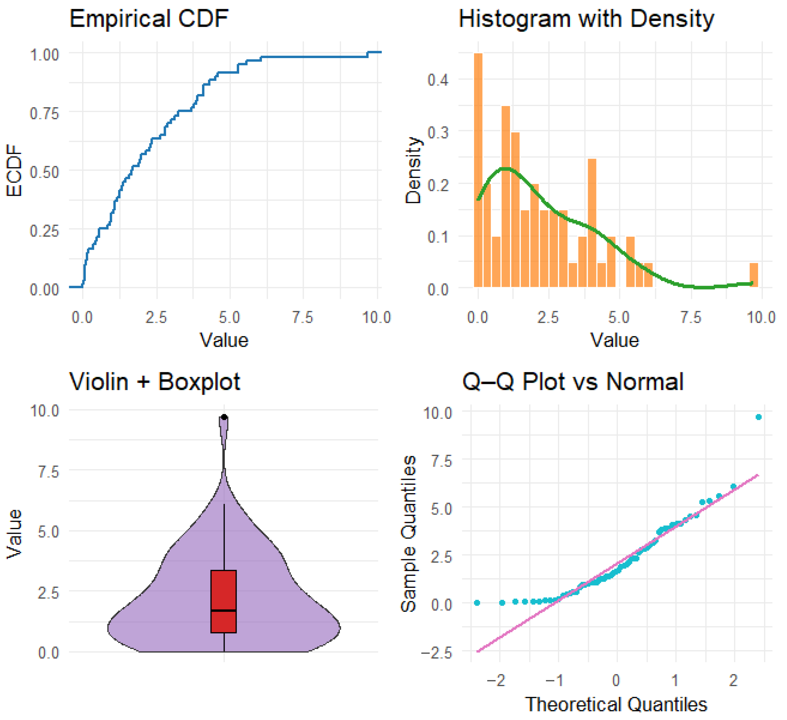 Exploratory plots for the COVID-19 mortality data, including: the empirical cumulative distribution function (blue), histogram with overlaid kernel density estimate (red), violin and boxplot representation (green), and the Q–Q plot against the normal distribution (black).