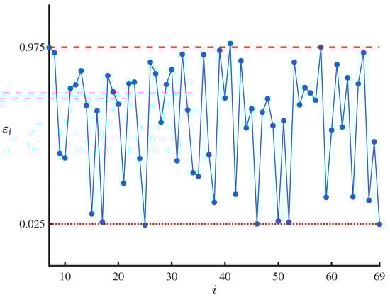 By substituting the obtained residual-based improved uncertain maximum likelihood estimations , , , and into , we can generate 63 residuals , which are shown in Table 4 and Figure 2. In order to test whether the obtained residual-based improved uncertain maximum likelihood estimations , , , and are appropriate, we first take the significance level as . Then it follows from and the work of Ye and Liu [] that the test is