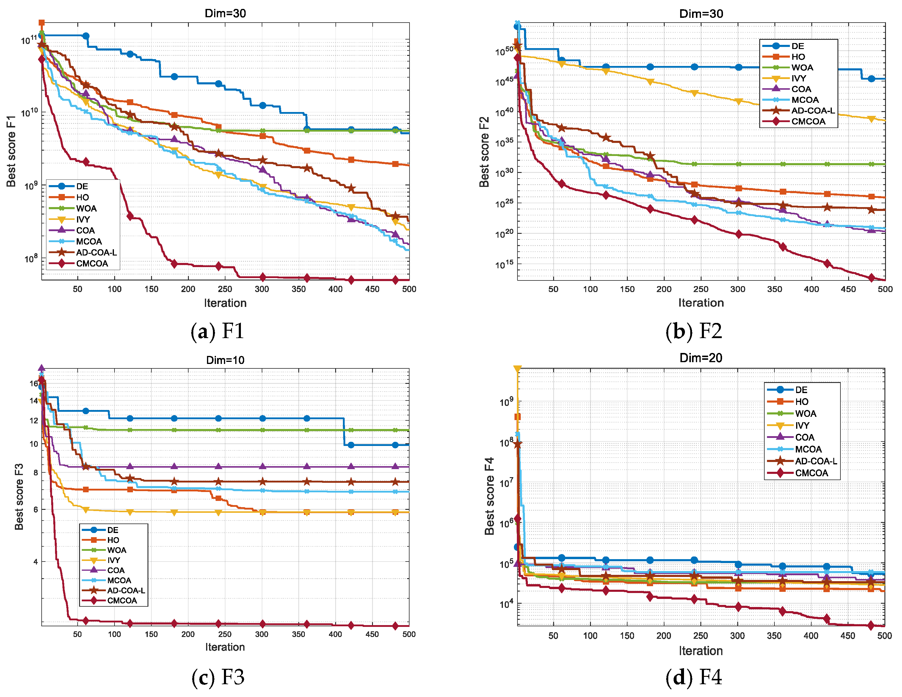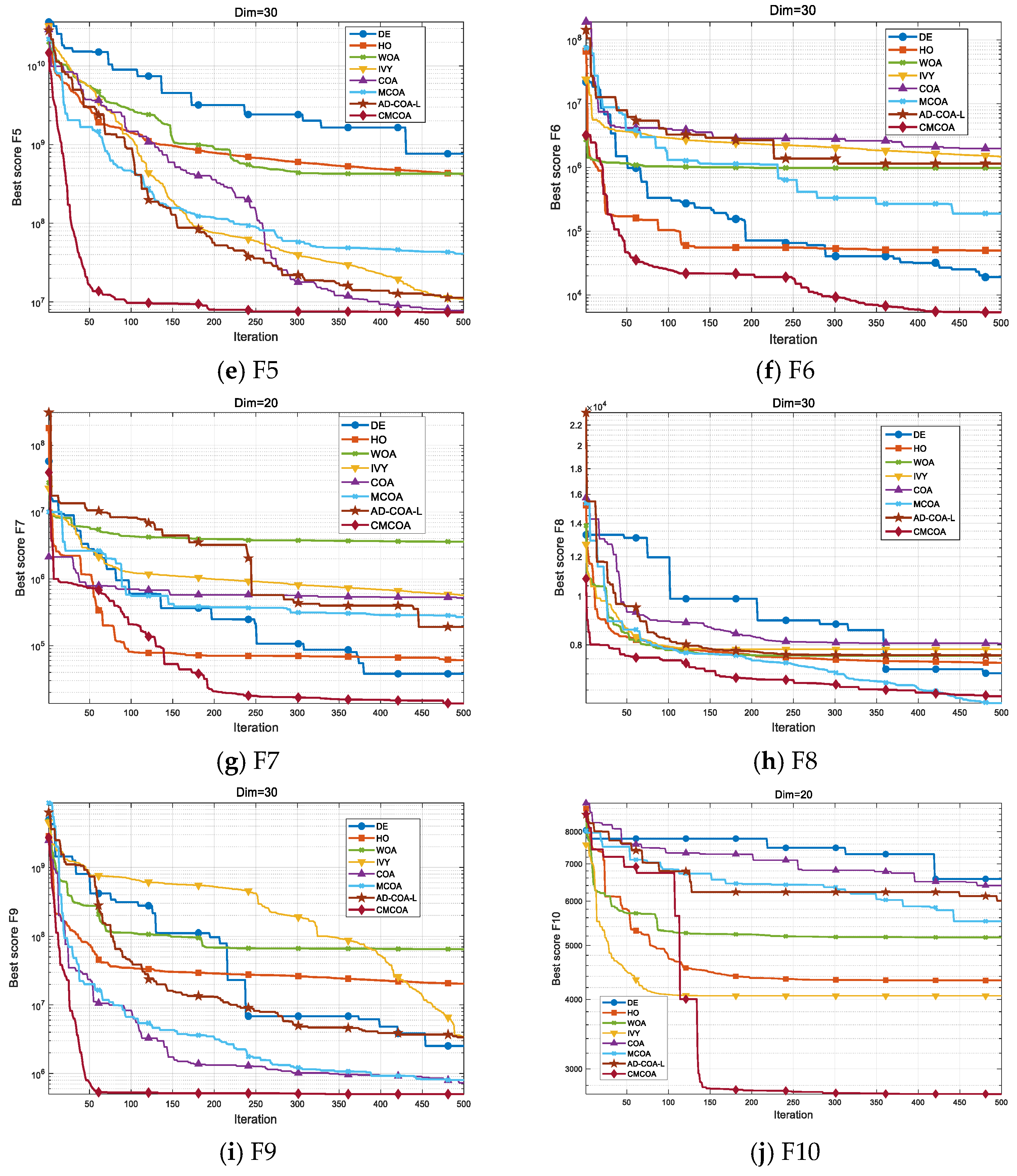 | Function | DE [25] | HO [26] | WOA [27] | IVY [28] | COA [11] | MCOA [13] | AD-COA-L [14] | CMCOA | |