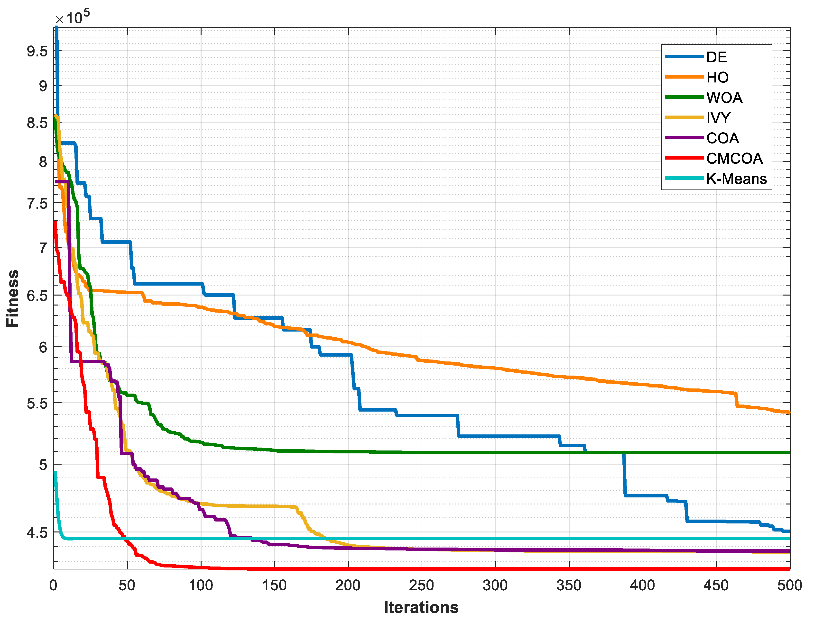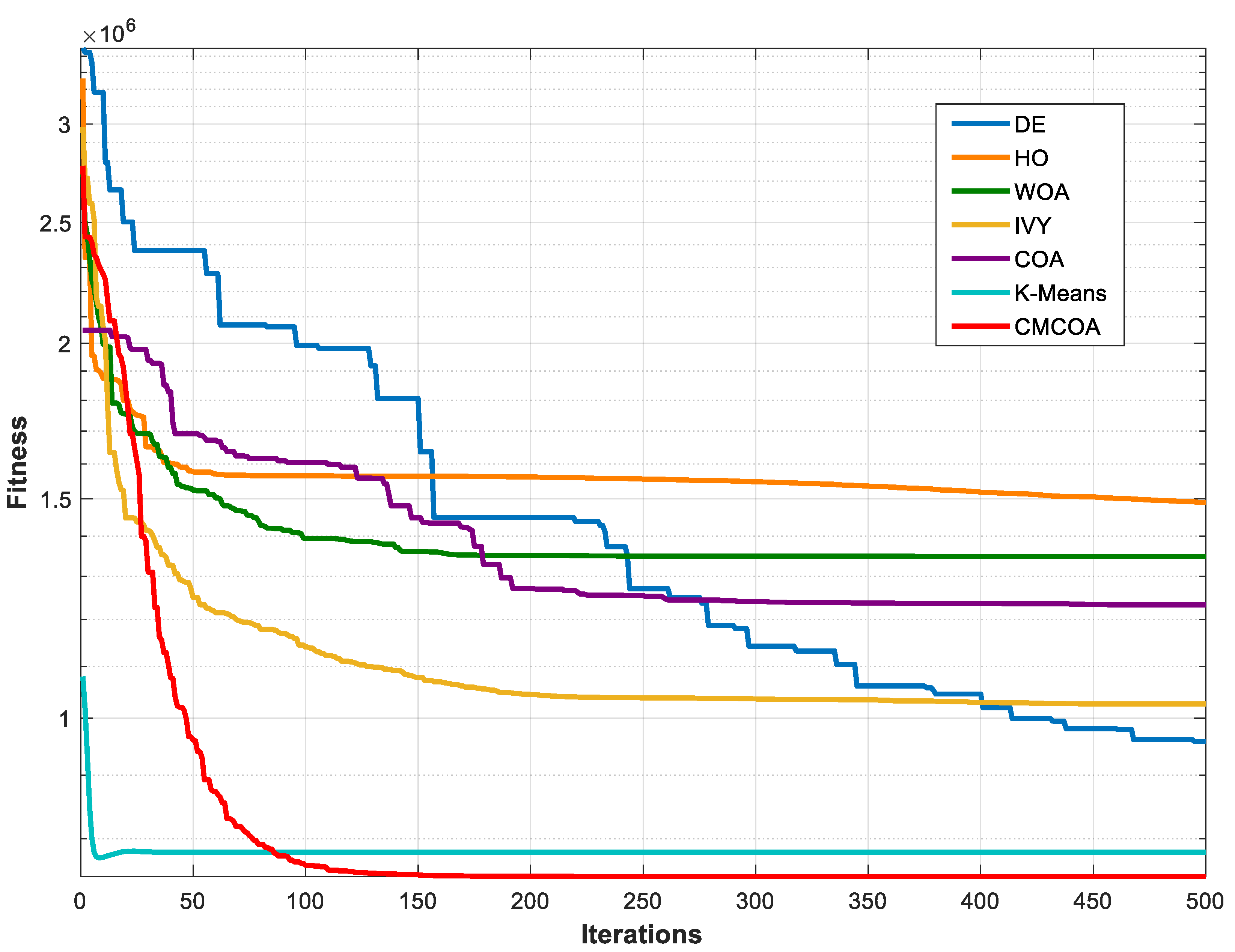 | Test Image 1 | DE [25] | HO [26] | WOA [27] | IVY [28] | COA [11] | K-Means [38] | CMCOA |