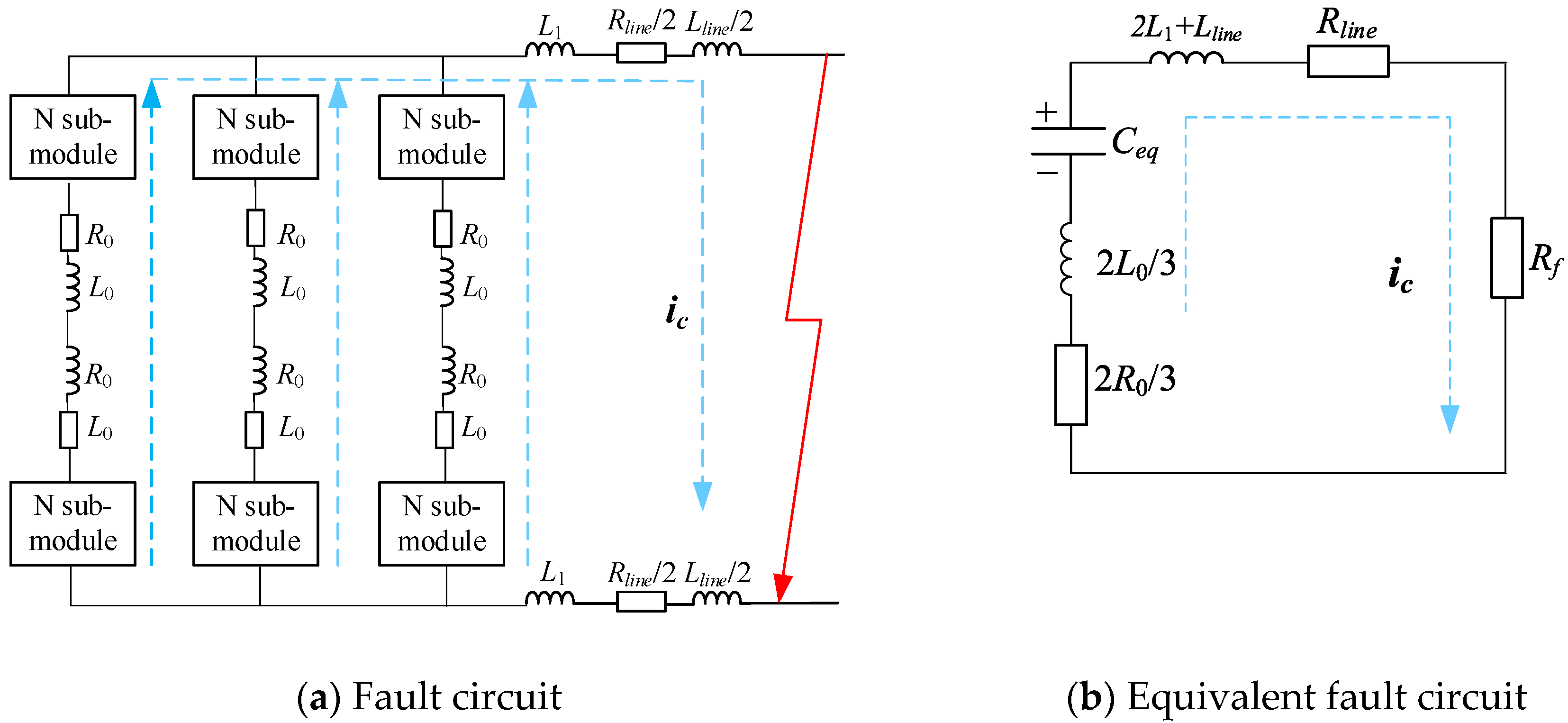 After the occurrence of a pole-to-pole short circuit, the submodule capacitors in all three-phase arms of the converter discharge toward the fault point. The corresponding fault circuit is illustrated in
