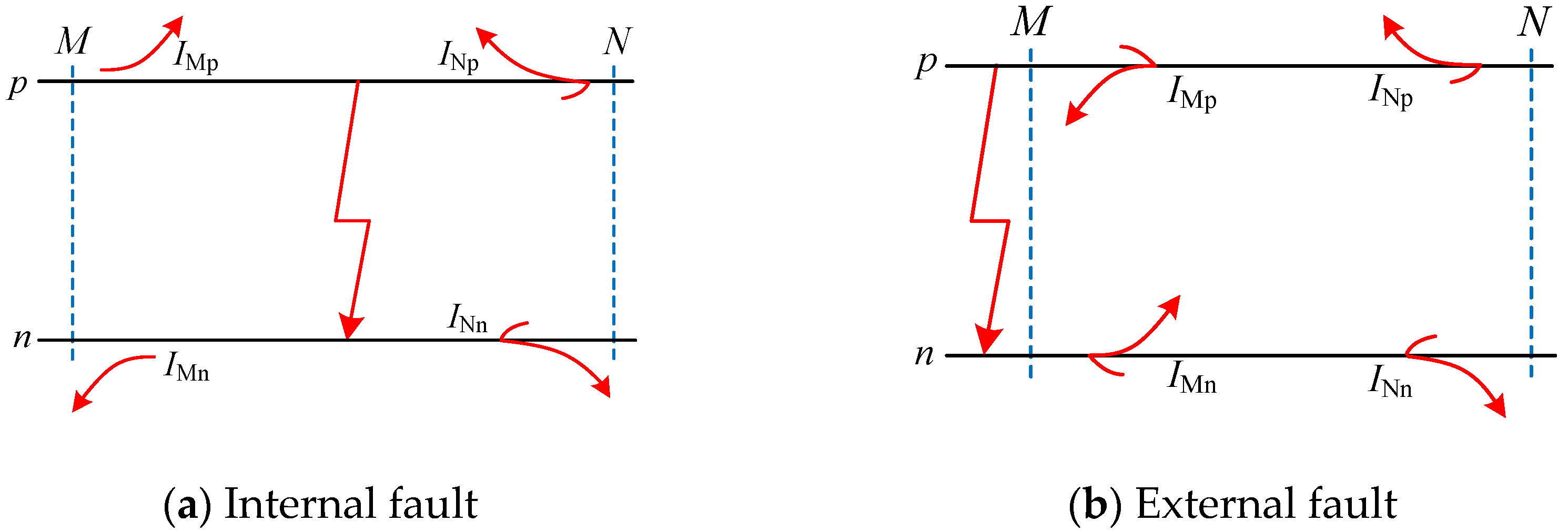 Figure 2 as a reference, the symmetrical and asymmetrical characteristics of fault current are examined when faults occur in different regions, emphasizing the role of symmetry in fault analysis. During normal operation, current flow from terminal M to terminal N exhibits a symmetrical balance between the positive and negative poles. The annotated red curves convey dual information: the vertical alignment of the arrows signifies whether the fault current is increasing or decreasing in magnitude, while the horizontal alignment reveals the actual physical direction of current flow, which may display symmetrical patterns under balanced conditions or asymmetry during faults. In accordance with the adopted sign convention, red curves plotted below the positive and negative pole lines indicate current values that are negative (flowing opposite to the reference direction), while those above represent positive values (flowing in the reference direction). Moreover, the spatial separation between these curves and the pole lines is proportional to the instantaneous current magnitude, and the symmetry of this separation provides a visual cue for distinguishing fault types.