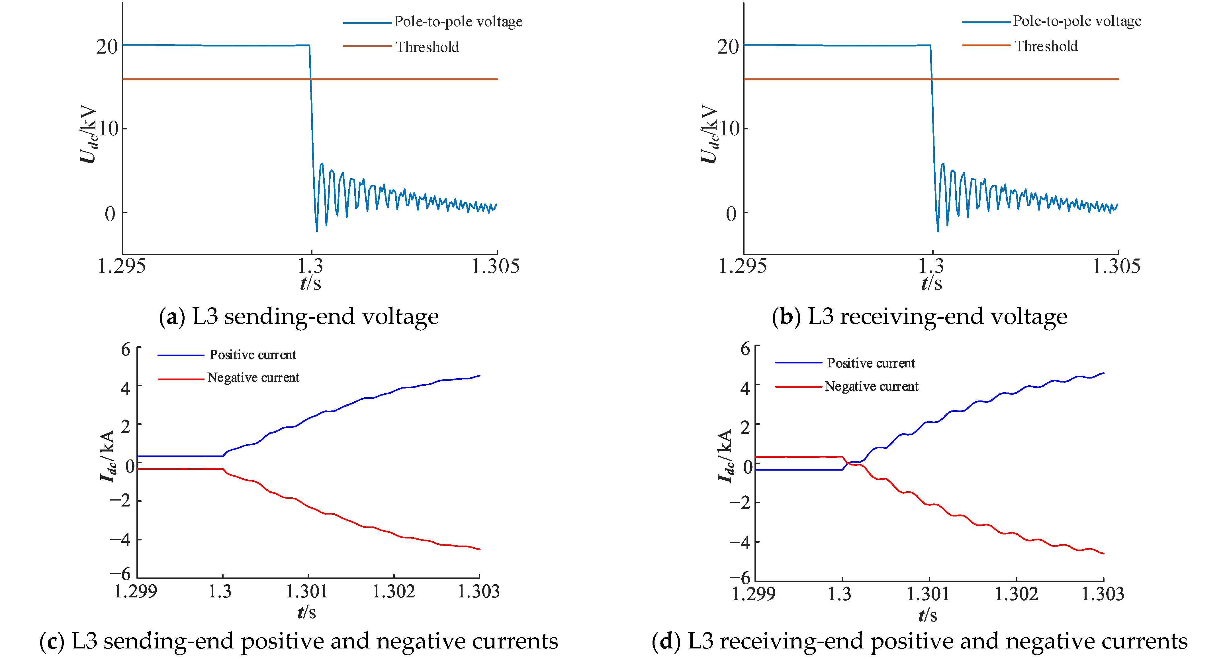 The proposed protection scheme was evaluated through simulation under a specific fault scenario. Following 1.3 s of stable system operation, a Pole-to-Pole fault incorporating a 0.1 Ω transition resistance was initiated at the central point of transmission line L3. Relevant simulation outcomes, demonstrating the system’s dynamic response and protection performance, are presented in