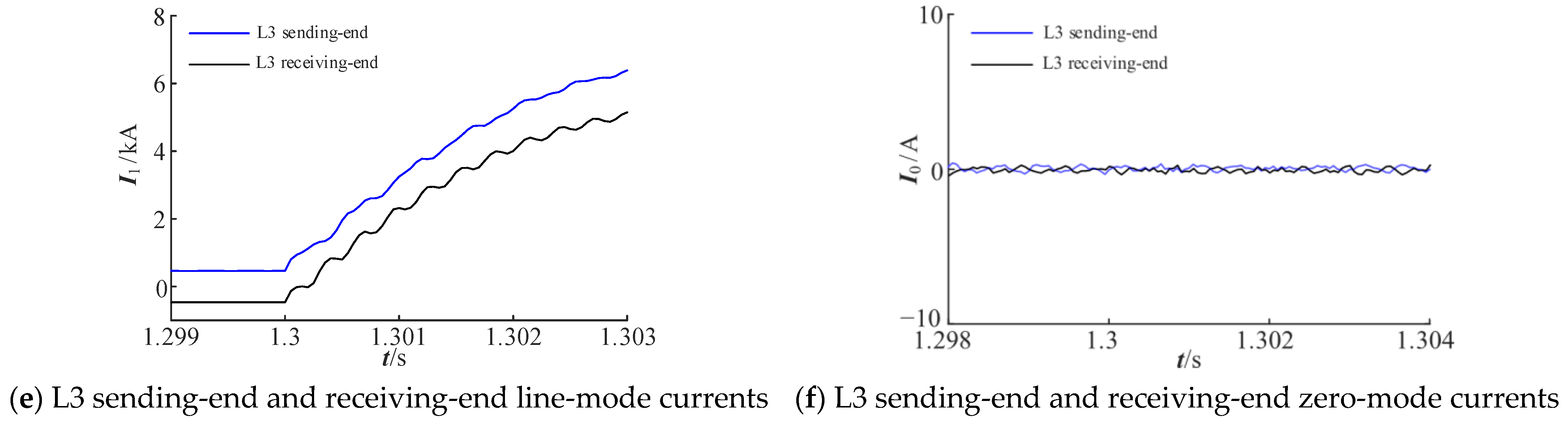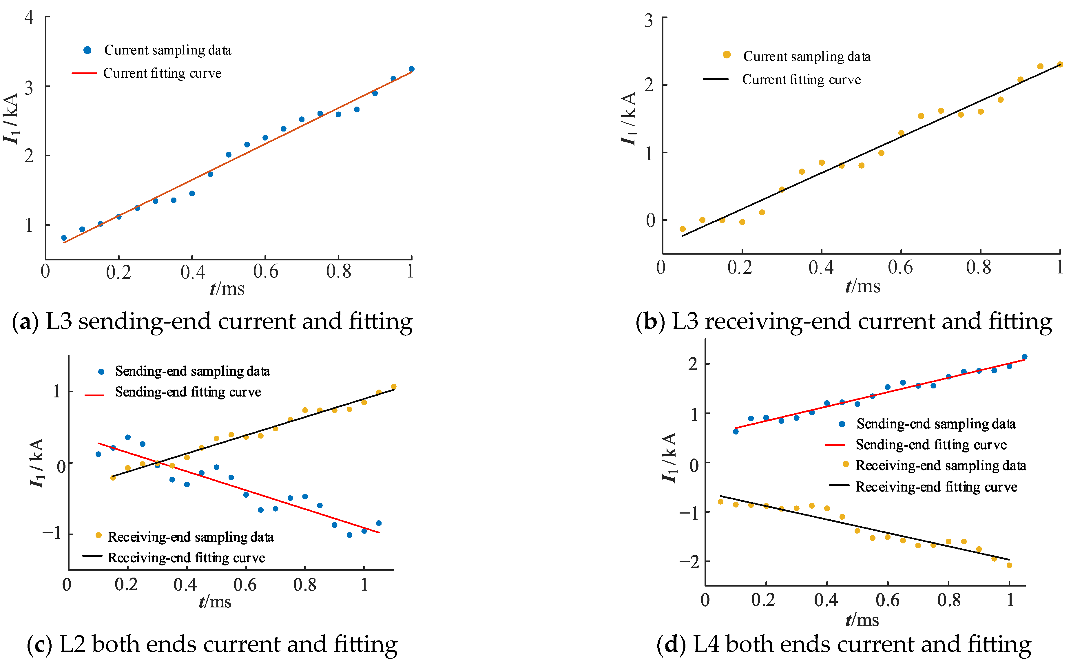 Figure 6 illustrates the fitting results of the line-mode currents measured at both ends of each line.