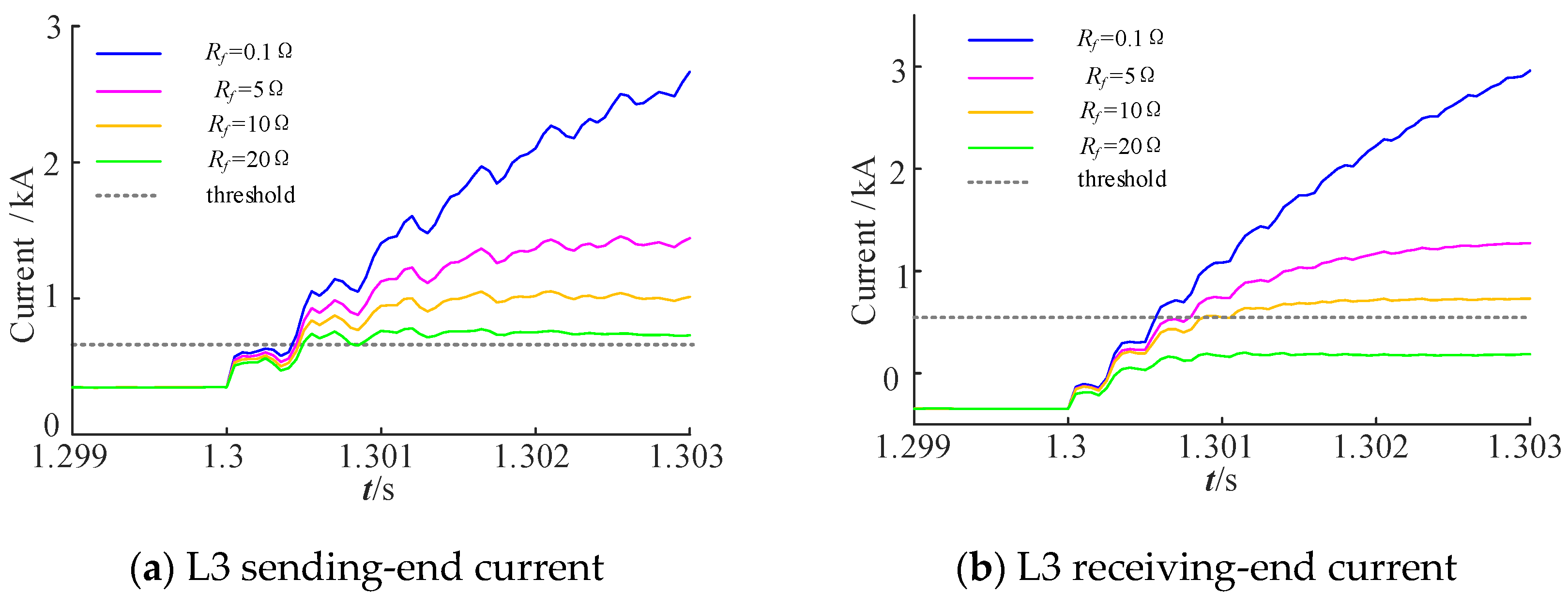 Here, kM and kN denote the line-mode current slopes corresponding to the beginning and the end of the transmission line. Under high-impedance fault conditions, the line current exhibits a gradual rise due to increased resistance, resulting in a reduced slope when fitted. This study aims to set the maximum high-resistance fault condition at 20 Ω, reflecting the typical severity of pole-to-pole short-circuit faults where the actual fault resistance remains relatively low. Analytical results indicate that for faults with resistance up to 20 Ω, the rate of change in the line-mode current exceeds 0.2 kA/ms. To ensure sufficient sensitivity, the threshold kset is conservatively set at 0.1 kA/ms.