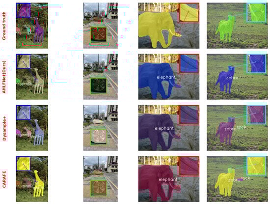 However, nearest-neighbor and bilinear interpolation introduce two critical issues that severely affect downstream tasks: intra-class conflict and edge drift. Intra-class conflict refers to inconsistencies in feature representation within the same object during interpolation or feature fusion, caused by variations in illumination, shape, or structural differences. For example, the skin region of a human face exhibits smooth textures and gradual color changes, while the eyes contain strong edges and high-contrast details. Similarly, car wheels and windows often exhibit pronounced intra-class conflict. Such conflict within the same category result in disorganized feature representations after interpolation, ultimately weakening the model’s discriminative ability. As shown in Figure 1, edge drift refers to the phenomenon where object boundary features become excessively blurred or shifted due to the smoothing effects of simple interpolation methods such as nearest-neighbor or bilinear interpolation, resulting in boundary information that is inconsistent with the actual object contour. This misalignment significantly degrades the performance of downstream tasks that rely on precise boundaries, such as segmentation and detection. FPN [] has pointed out that traditional feature fusion, due to its sampling mechanism, fails to effectively handle intra-class conflict. Similarly, Sapa [] and FADE [] demonstrate that simple interpolation algorithms tend to oversmooth features, resulting in edge drift. Furthermore, high-frequency noise within objects leads to nonsmooth fluctuations that disrupt intra-class consistency []. In addition, SSFA [] shows that the absence of high-frequency information in boundary regions causes semantic contour displacement errors. The design philosophy of this paper is inspired by a form of functional symmetry: just as a complete visual perception system must simultaneously handle the two complementary aspects of semantic consistency and boundary precision, our AHLFNet also adopts a symmetrical dual-pathway architecture. we propose the Adaptive High–Low Frequency Collaborative Auxiliary Feature Alignment Network (AHLFNet), a novel method for enhancing feature fusion. This network comprises three key components: an Adaptive Low-Frequency Multi-Kernel Smoothing Unit (ALFU), a Gate-Controlled Selector (GCS), and an Adaptive High-Frequency Edge Enhancement Unit (AHFU). The ALFU selectively applies different convolution kernels depending on the size of similar regions to suppress high-frequency components within objects, thereby reducing intra-class conflict. During upsampling, this module maintains smoothness while overcoming the limitations of fixed kernel sizes, which are unable to balance both global smoothness and local detail preservation. Specifically, large-scale feature inconsistencies can be alleviated by emphasizing large kernels to smooth and upsample coarse high-level features, thereby reducing pixel-level differences and mitigating feature inconsistency. In contrast, fine-grained boundaries require small kernels to preserve details and avoid blurring. The GCS adaptively determines kernel size based on regional similarity. It conducts local similarity analysis using three dilated convolutions with different dilation rates. If the similarity among the three kernels is consistent, the large kernel is selected. If the similarities of the small and medium kernels are consistent, the medium kernel is chosen. If the small kernel differs significantly from the other two, or in other ambiguous cases, the small kernel is selected. This mechanism ensures that, during upsampling, sampled pixels exhibit higher similarity with their neighboring pixels, thereby reducing intra-class conflict. As a result, the enhanced similarity and discriminability of intra-class features make this mechanism particularly effective for dense prediction tasks. Although the ALFU and GCS effectively reconstruct upsampled high-level features with low intra-class conflict and clear boundaries, fine-grained edge details in low-level features remain difficult to fully recover in high-level representations during downsampling. According to the Nyquist–Shannon sampling theorem, any frequency component above the Nyquist frequency is irreversibly lost during downsampling. To address this, we introduce the AHFU, which compensates for boundary details beyond the Nyquist frequency that cannot be restored through upsampling. By capturing low-level high-frequency details lost during downsampling, this unit significantly improves boundary localization accuracy. Together, these three modules reconstruct fused features that are both semantically consistent and boundary-sharp. The main contributions of this study can be summarized as follows: