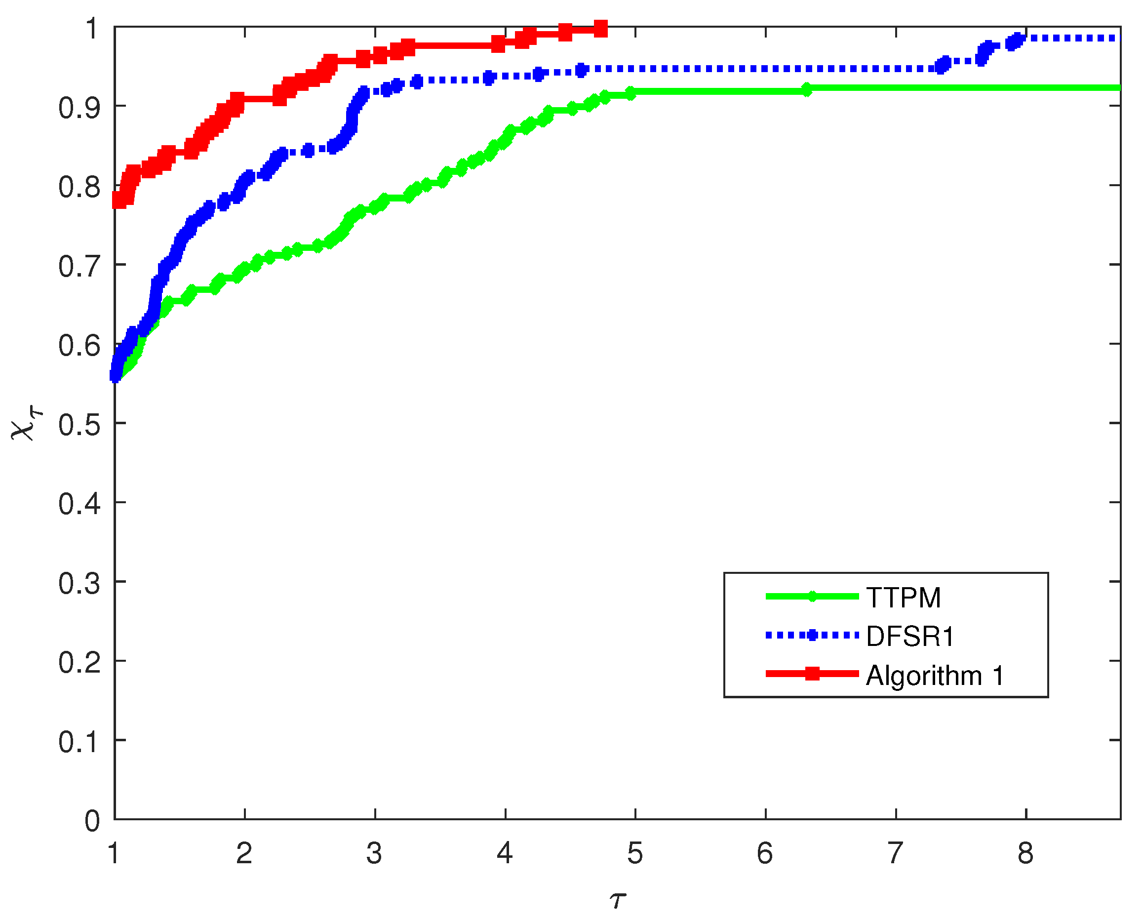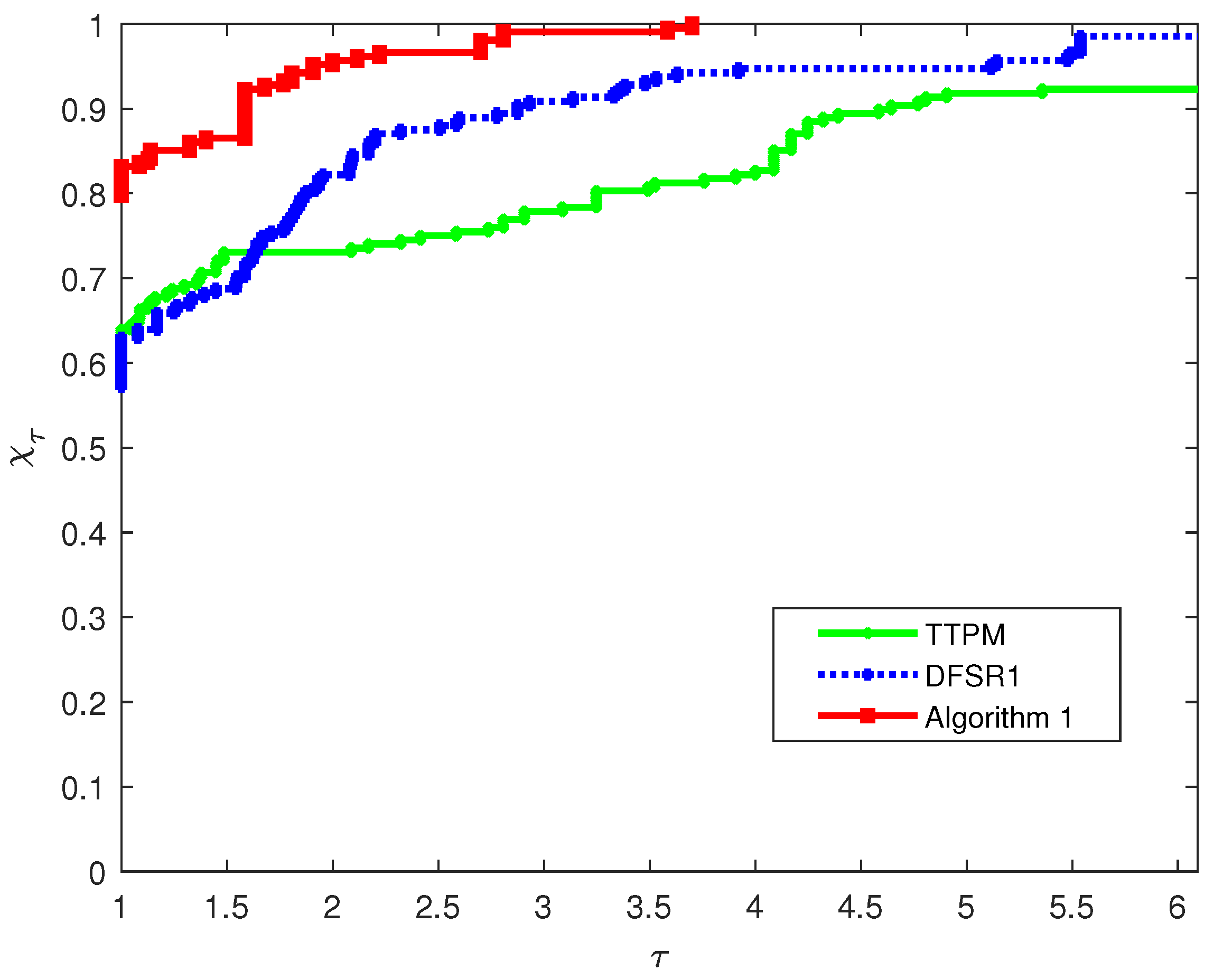 reaches around 1.5, the curve of Algorithm 1 rises significantly faster and remains at the top afterward—this clearly demonstrates its notable advantage in iteration efficiency. In contrast, the proportion of solved problems for DFSR1 grows relatively slowly, while TTPM is less competitive in iteration performance compared to the other two algorithms.
