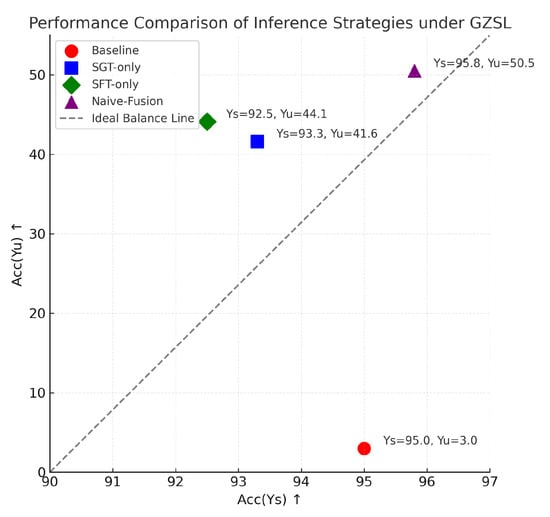To visually substantiate the proposed method’s effectiveness in mitigating bias, Figure 4 compares the performance of various reasoning strategies in the source and target classes in the GZSL setting. It can be seen that single-branch methods suffer from a notable performance discrepancy between source and target classes. Specifically, the SGT-only method favors seen classes, whereas SFT-only, although it improves the recognition of target classes, compromises the performance on source classes. This suggests that a single branch struggles to achieve a balanced performance between the two types of classes. The results also indicate a complementary relationship between semantic embedding and pseudo-semantic prototypes in the reasoning process. In contrast, the fusion strategy significantly boosts the performance on unseen classes while preserving the accuracy on source classes, thereby achieving a more balanced overall performance. The result points are closer to the ideal diagonal, suggesting that the model has effectively reduced the bias toward source classes and achieved a better equilibrium between source and target class performance.