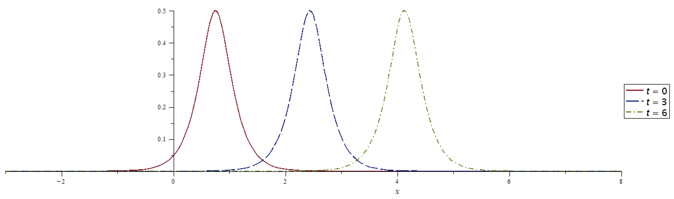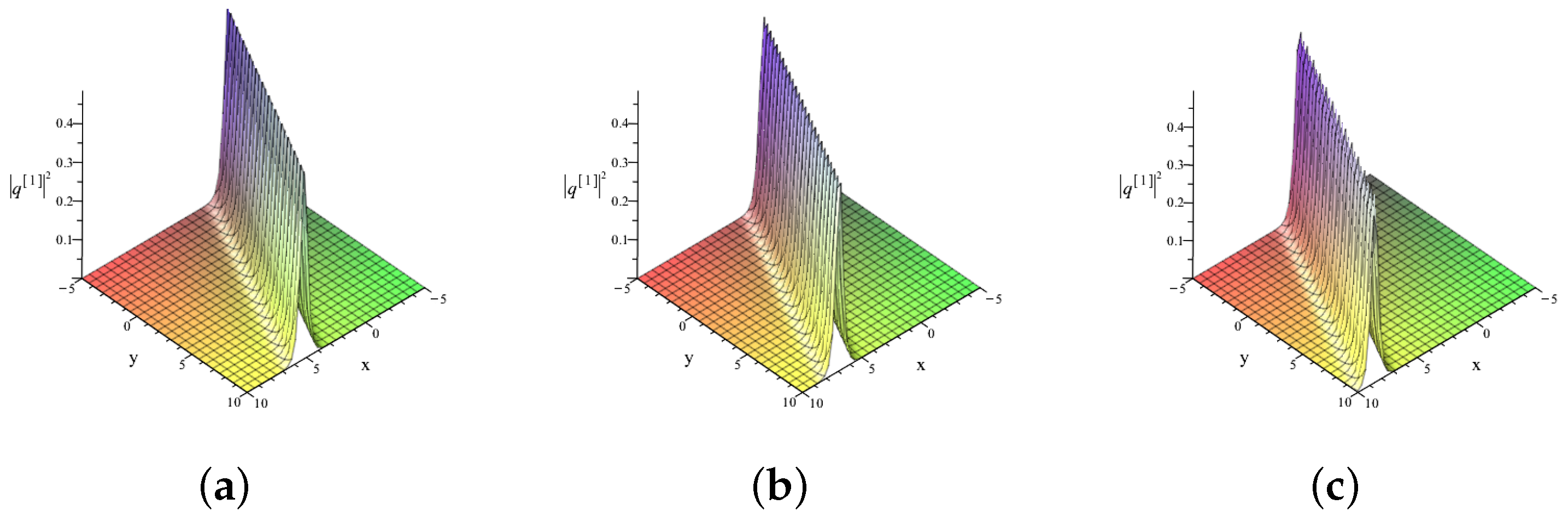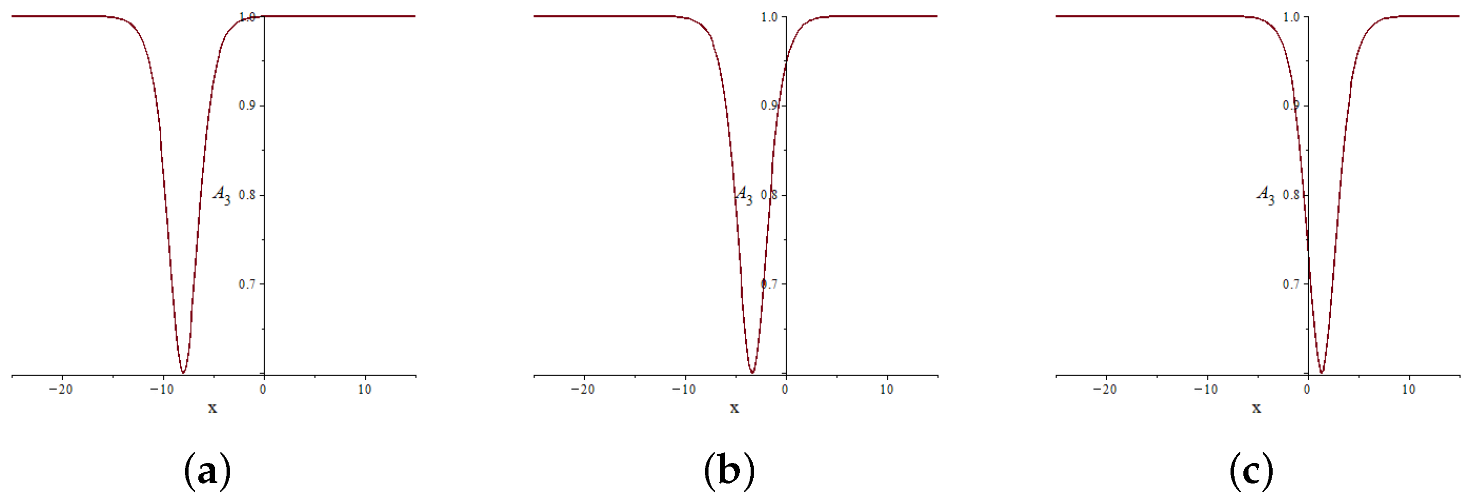 Figure 3 illustrates the propagation of the one-soliton solution described by Equation (