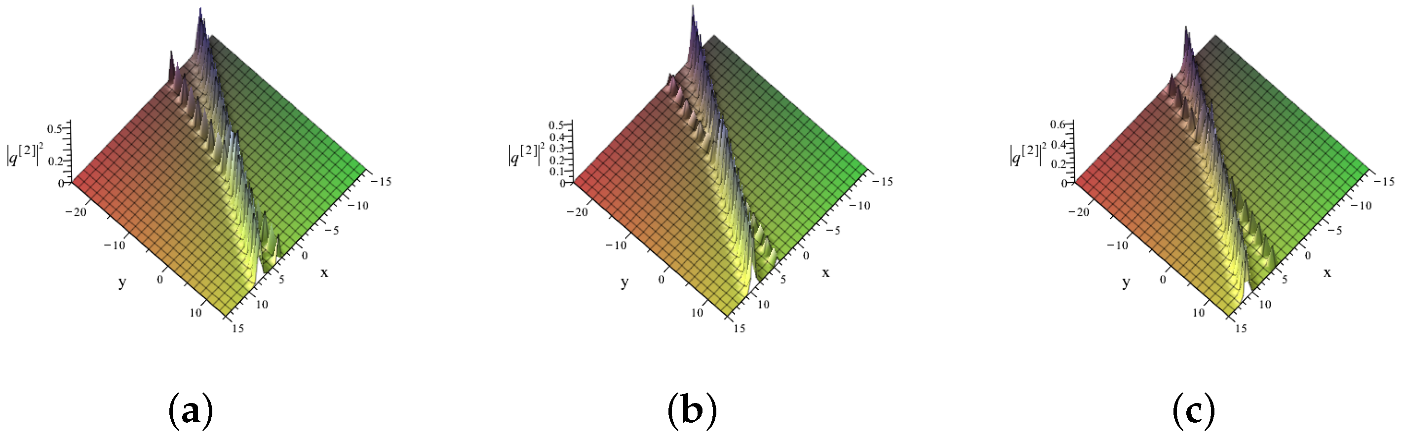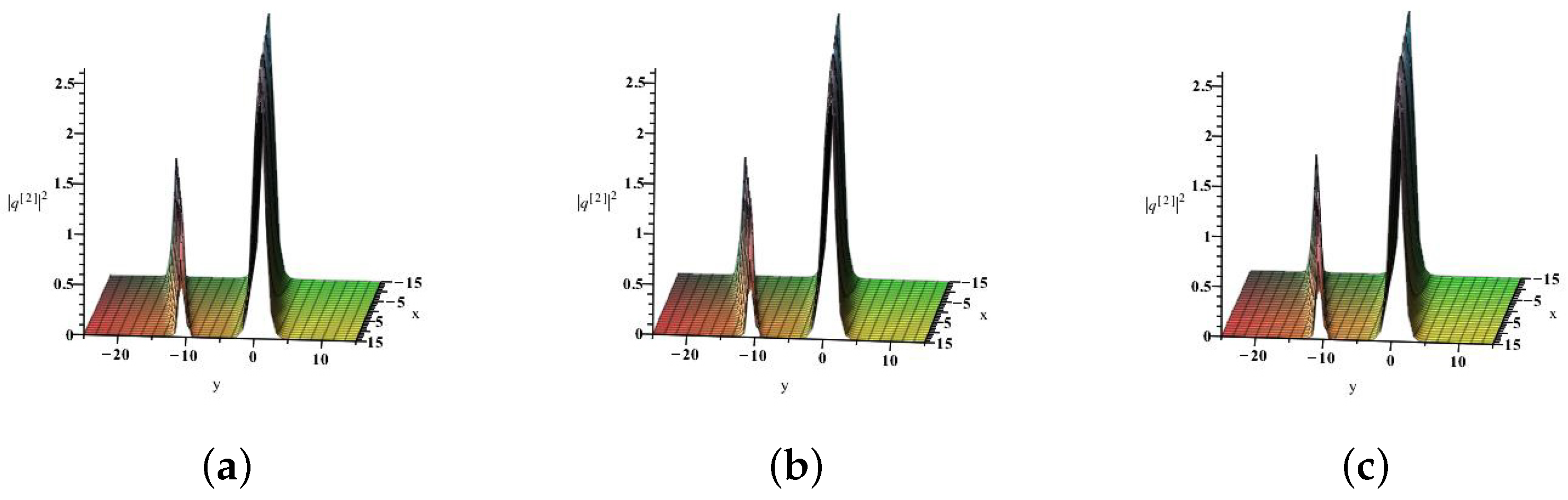 Figure 3a–c shows three-dimensional profiles of the soliton at time