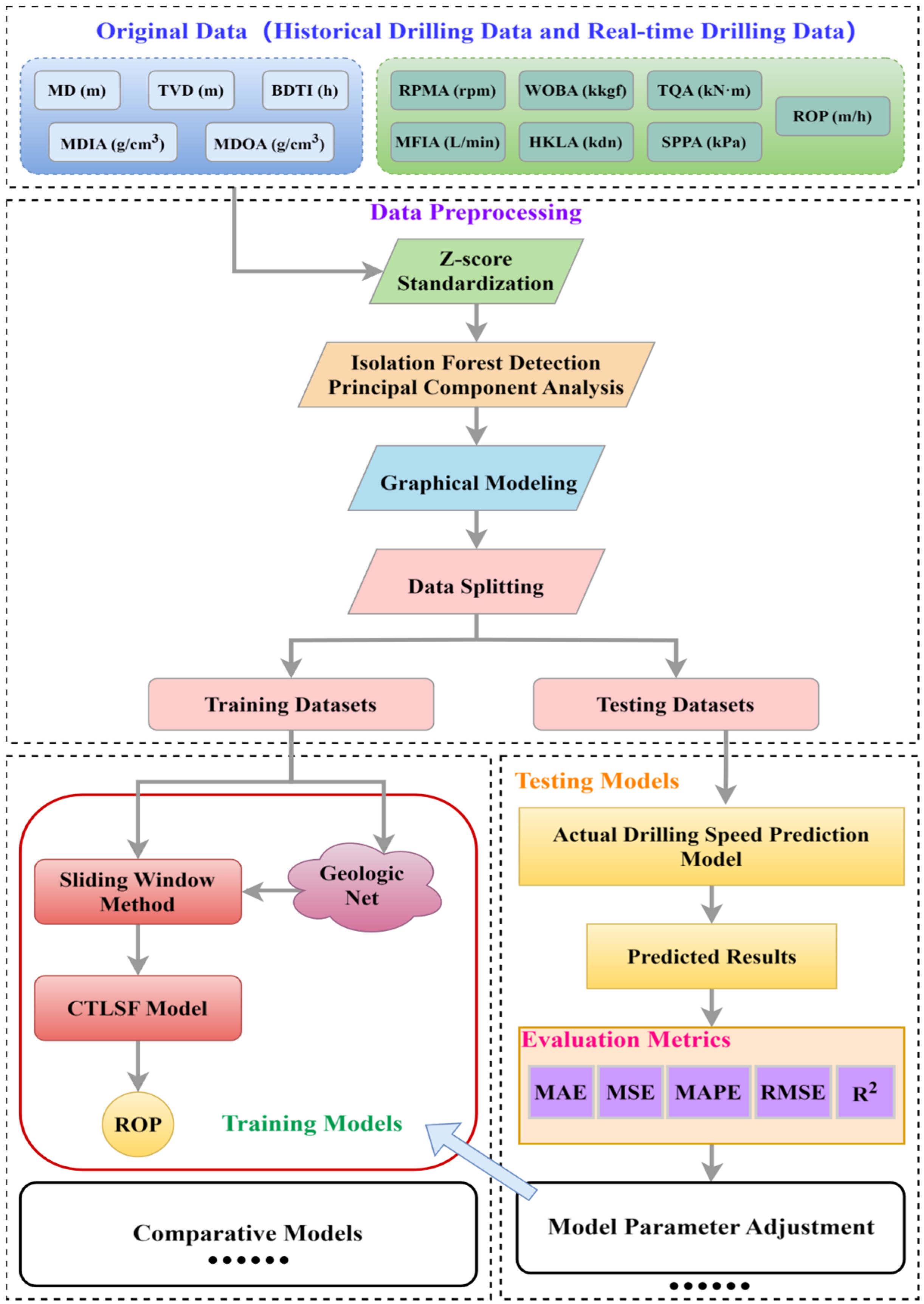 21] further proposed a comprehensive workflow encompassing data acquisition, preprocessing, model construction, and performance evaluation, which significantly improved the accuracy of drilling efficiency prediction and achieved notable advantages over traditional approaches. In a related study, Skrobek [