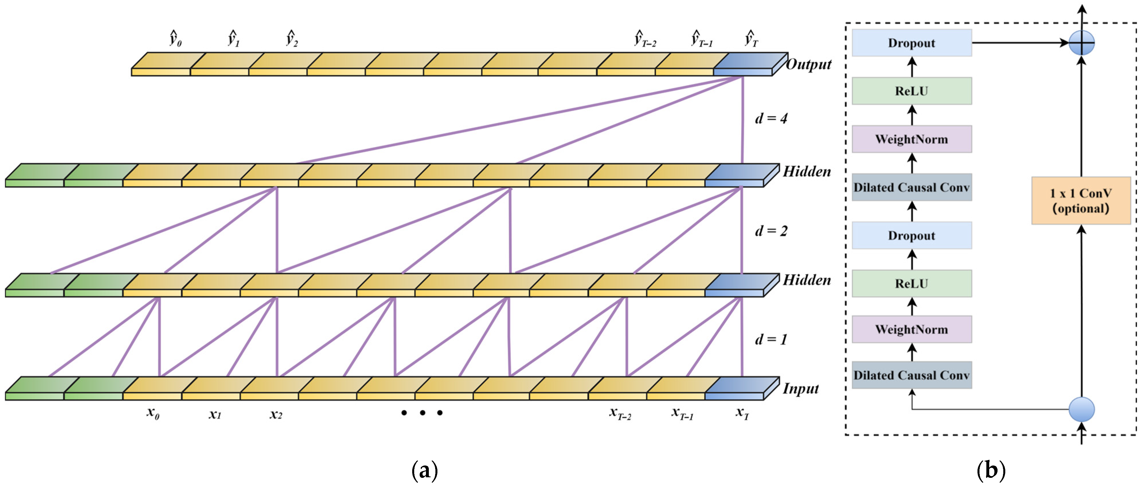 increases, the receptive field of the TCN expands, allowing for the reception of more information. To mitigate the vanishing gradient problem in deep networks, TCN incorporates residual connections. As shown in