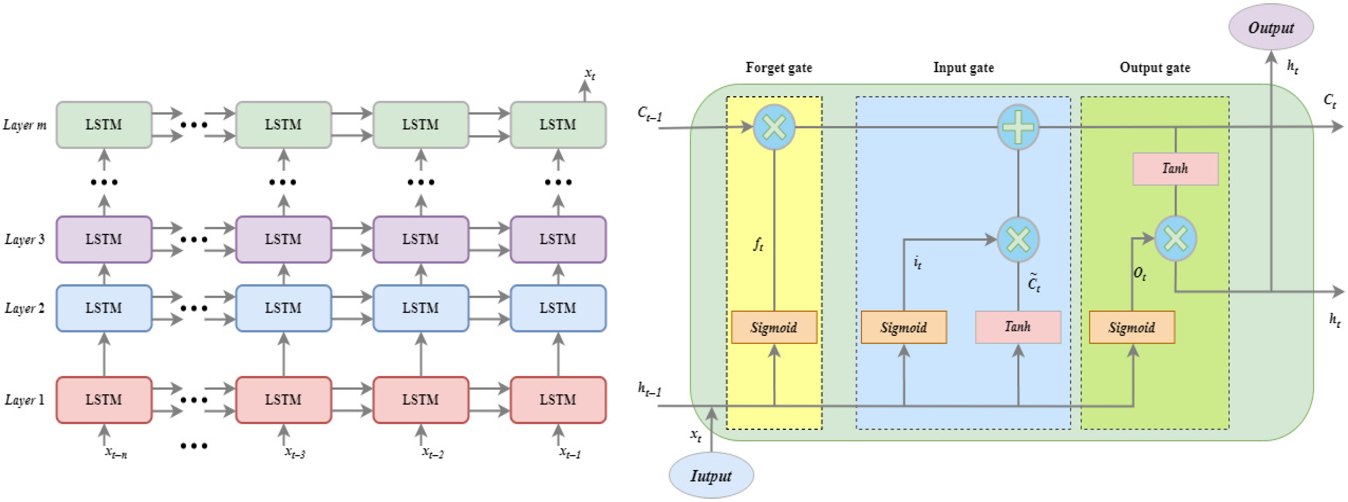 Figure 5, the LSTM Network is composed of multiple LSTM subunits arranged in a hierarchical structure, with each subunit consisting of a forget gate, an input gate, and an output gate.