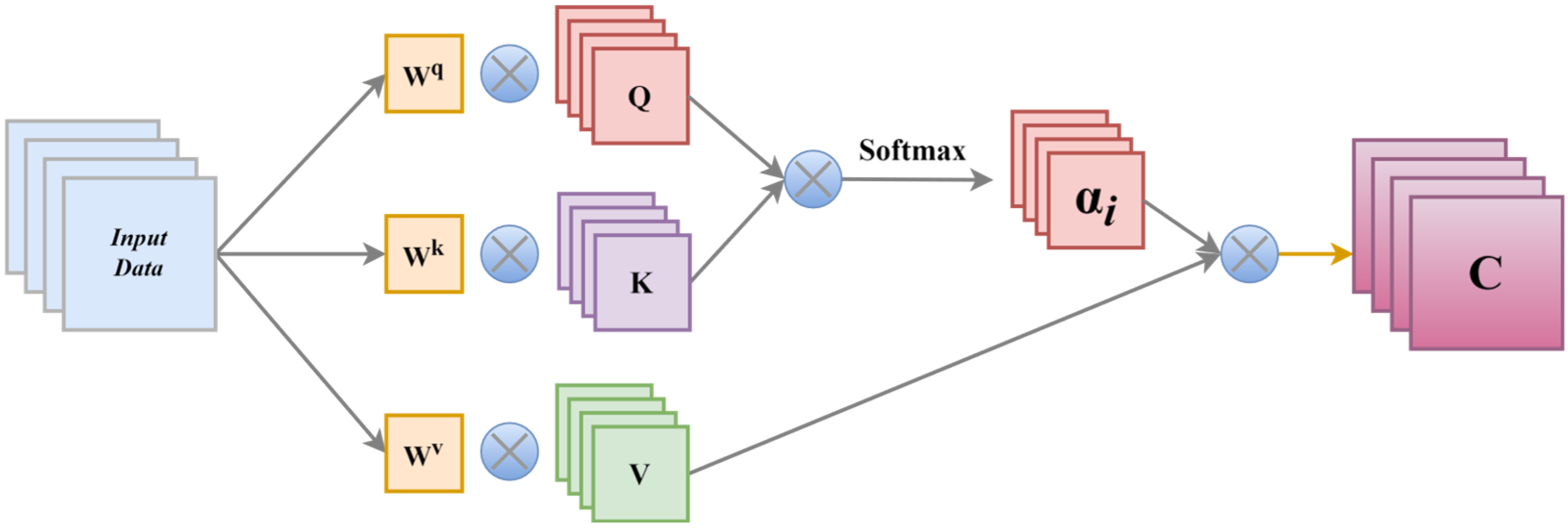 In the equation, WK, WQ, and WV are the weight matrices learned during training, which are used to transform the input into the query, key, and value vectors, respectively, with C representing the final output.