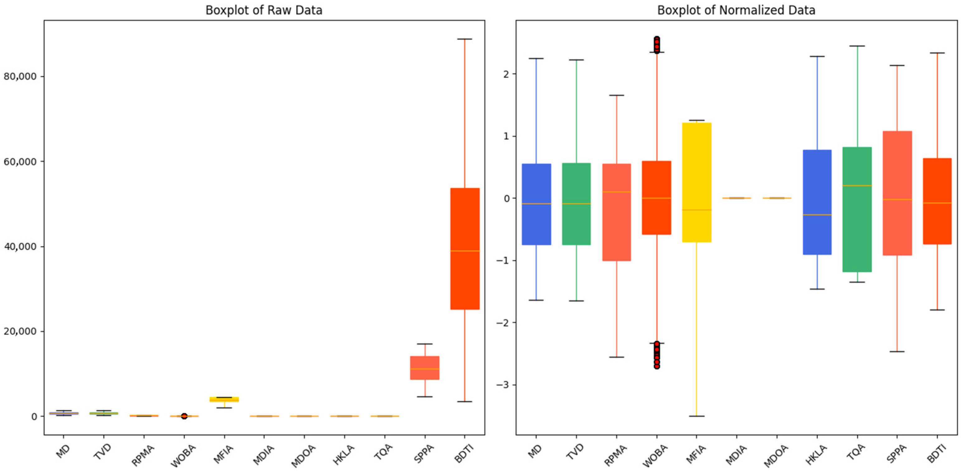 µ is the mean of the data. In this study, Z-score normalization was applied to all parameters, ensuring a more uniform distribution of the input data in the feature space. This improved both the model’s convergence speed and prediction accuracy. The effects of the normalization are shown in