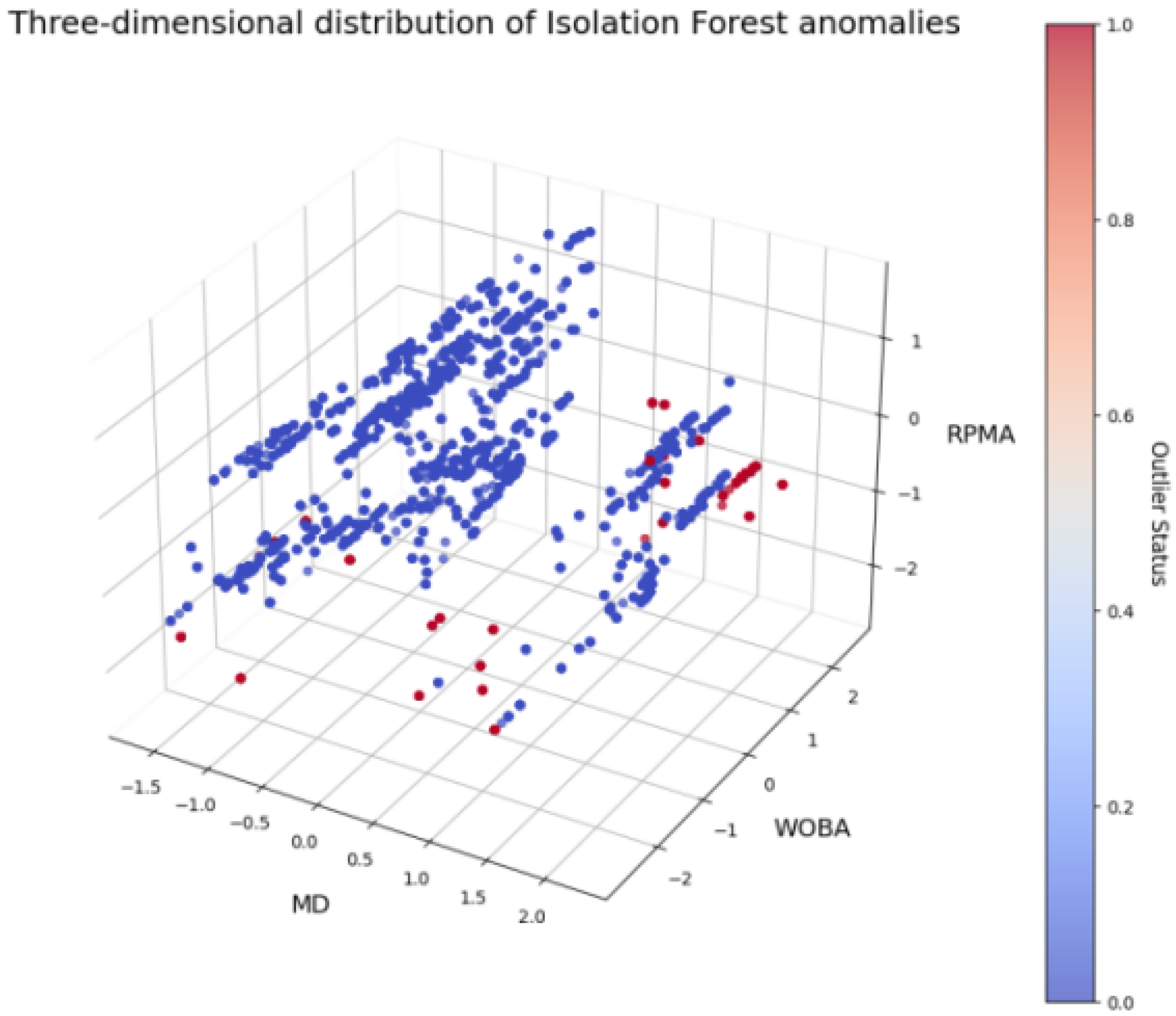 To ensure data quality, further detection and processing of outliers in the dataset were performed. Outliers may arise from measurement errors, data acquisition noise, or extreme conditions and can negatively impact the stability and generalization performance of the model. In this section, the Isolation Forest algorithm was employed for anomaly detection to identify outliers in the data. Isolation Forest is an unsupervised machine learning algorithm specifically designed for anomaly detection, which isolates outliers by randomly partitioning the feature space. In the algorithm design, the contamination parameter was set to 0.05, indicating that approximately 5% of the data points were considered outliers. The algorithm labels each data point, where −1 denotes an outlier and 1 denotes a normal point. Finally, representative features such as MD, WOBA, and RPMA were selected to construct a 3D scatterplot, with colors indicating outliers and normal points, as shown in