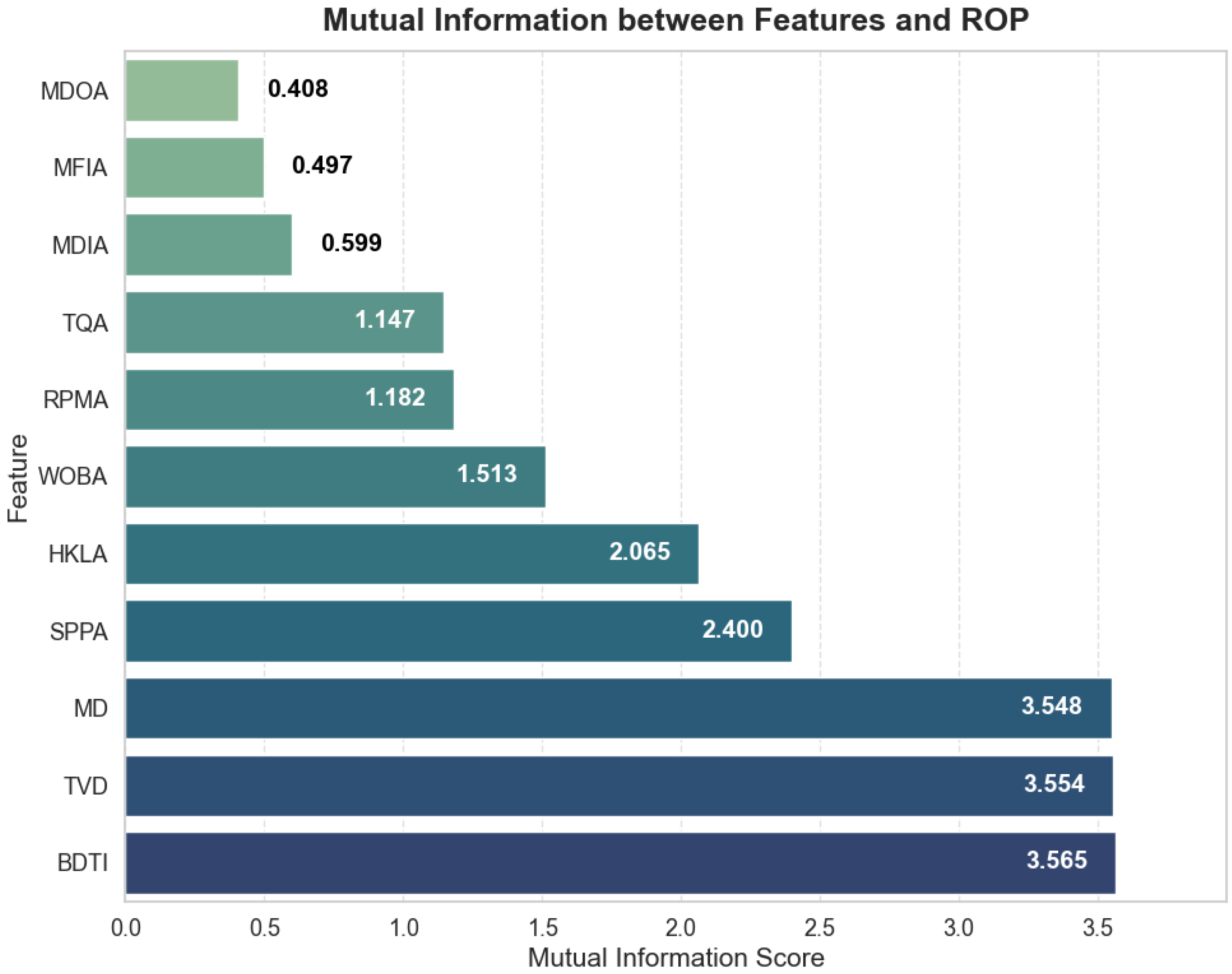 To thoroughly analyze the impact of drilling parameters on the rate of penetration (ROP), this study employed mutual information to quantitatively assess 11 parameters, aiming to reveal the correlation between each input feature and the target variable ROP. As shown in