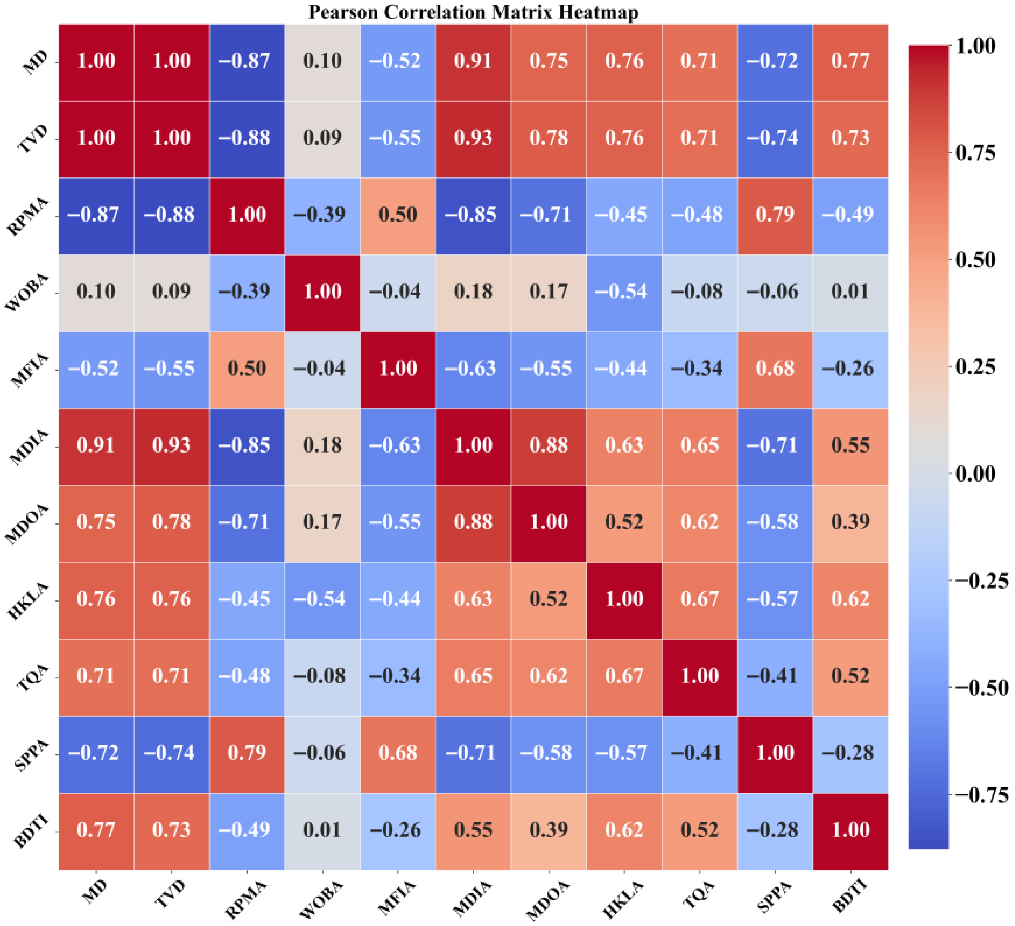 The drilling rate is influenced by a variety of complex factors, and there exists a certain degree of correlation between the input parameters. Therefore, careful selection of the input features is crucial in the construction of data-driven models. Correlation analysis, as one of the common methods for feature selection, provides a scientific basis for quantitatively characterizing the relationships between variables. In this study, graphical modeling techniques are employed to represent variables as nodes in a network, with edges indicating their correlations. The Pearson correlation coefficient is used to construct the correlation matrix, which quantitatively describes the linear relationships between the variables. Furthermore, a heatmap is used to visualize the correlation matrix, with a color gradient clearly illustrating the strength and direction of the correlations. Strongly correlated parameters are more prominently displayed in the heatmap, revealing potential key relationships.