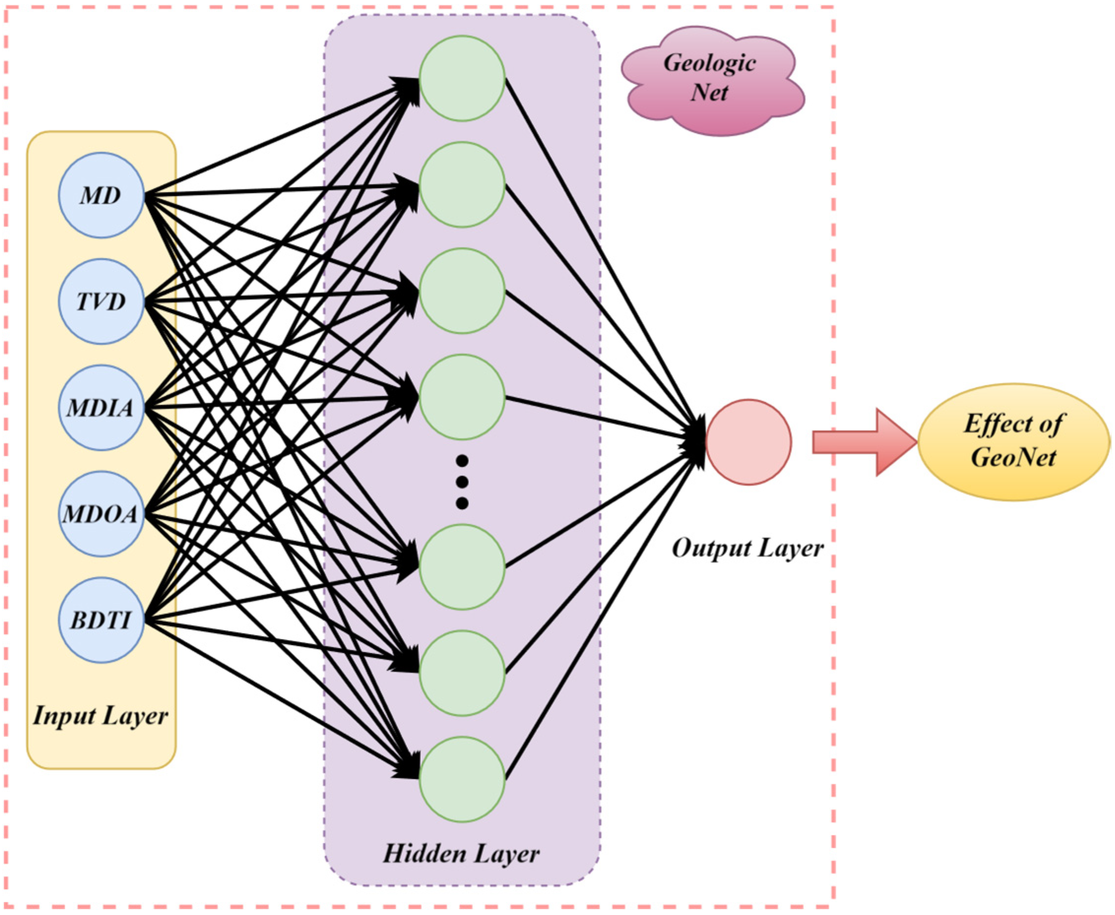Figure 12, the geological subnetwork is designed not merely as a standard MLP for dimensionality reduction or fusion, but as a domain-guided module tailored to extract deep representations from strongly correlated geological inputs. While it employs a fully connected neural network structure—including an input layer, two hidden layers, and an output layer—the novelty lies in its dedicated role and selective input mechanism within the entire model framework. Specifically, based on Pearson correlation analysis and geological domain knowledge, we select five highly interrelated parameters (MD, TVD, MDLA, MDOA, and BDTI) that characterize subsurface structural and lithological information. These are processed independently in this subnetwork to preserve internal correlations and enhance their semantic contribution, before being fused with dynamic drilling signals in the later stages of the model. This modular and hierarchical fusion design allows the network to mitigate multi-collinearity risks and avoid the curse of dimensionality that often occurs when high-dimensional static parameters are directly mixed with time-varying features.
