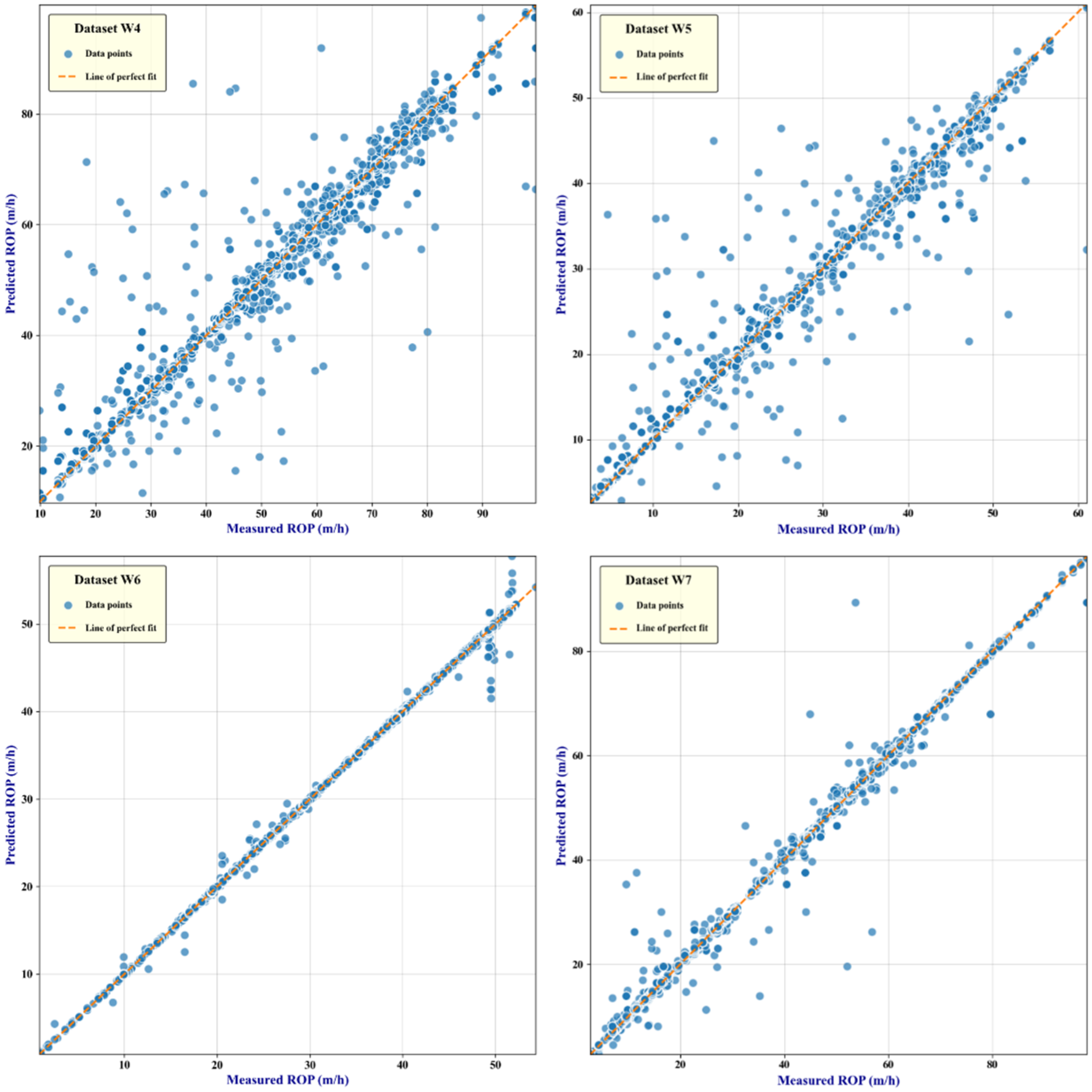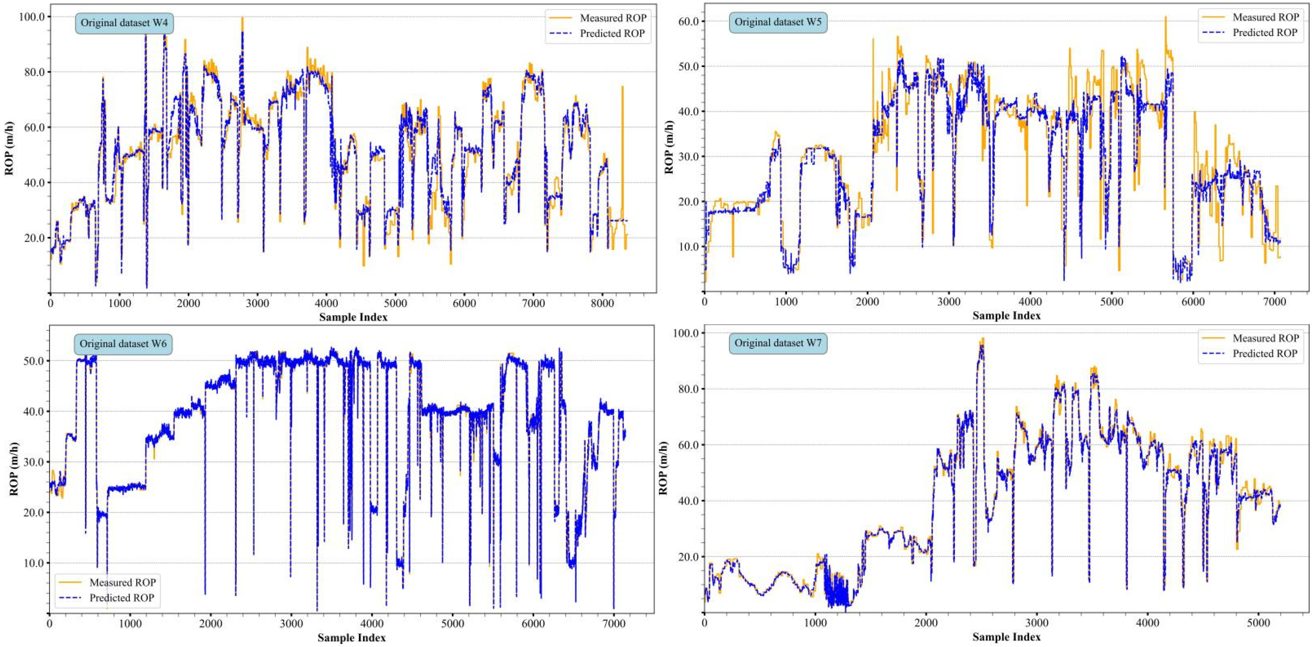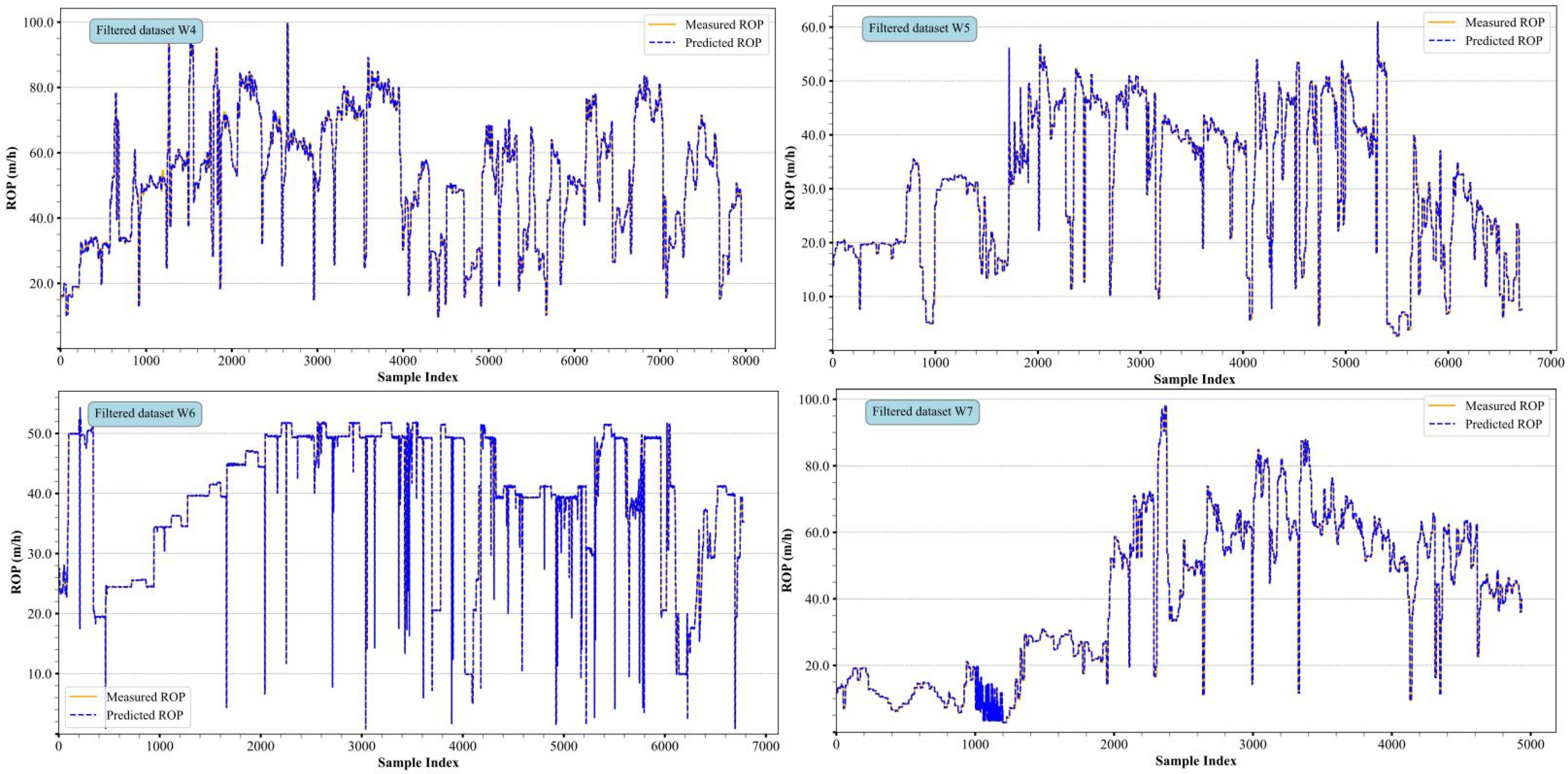 Figure 12, the horizontal coordinate x-axis represents the sample training time sequence, i.e., the beginning sample point to the end of the consecutive sample points, and the vertical coordinate y-axis represents the ROP value corresponding to the current sample point; in addition, the yellow solid line represents the real sample point, and the blue dotted line represents the ROP value corresponding to the current sample point predicted by the data-driven model. The figure includes subplots for the four different datasets, each illustrating the model’s performance in different drilling areas. From the overall trend, the measured and predicted values are closely aligned, indicating that the model designed in this study can effectively capture the drilling rate variation patterns, demonstrating a certain level of robustness. However, in regions with significant drilling rate fluctuations or intense oscillations, some deviations between the predicted and measured values still exist, which may reflect the model’s insufficient adaptability when handling high-frequency fluctuations.