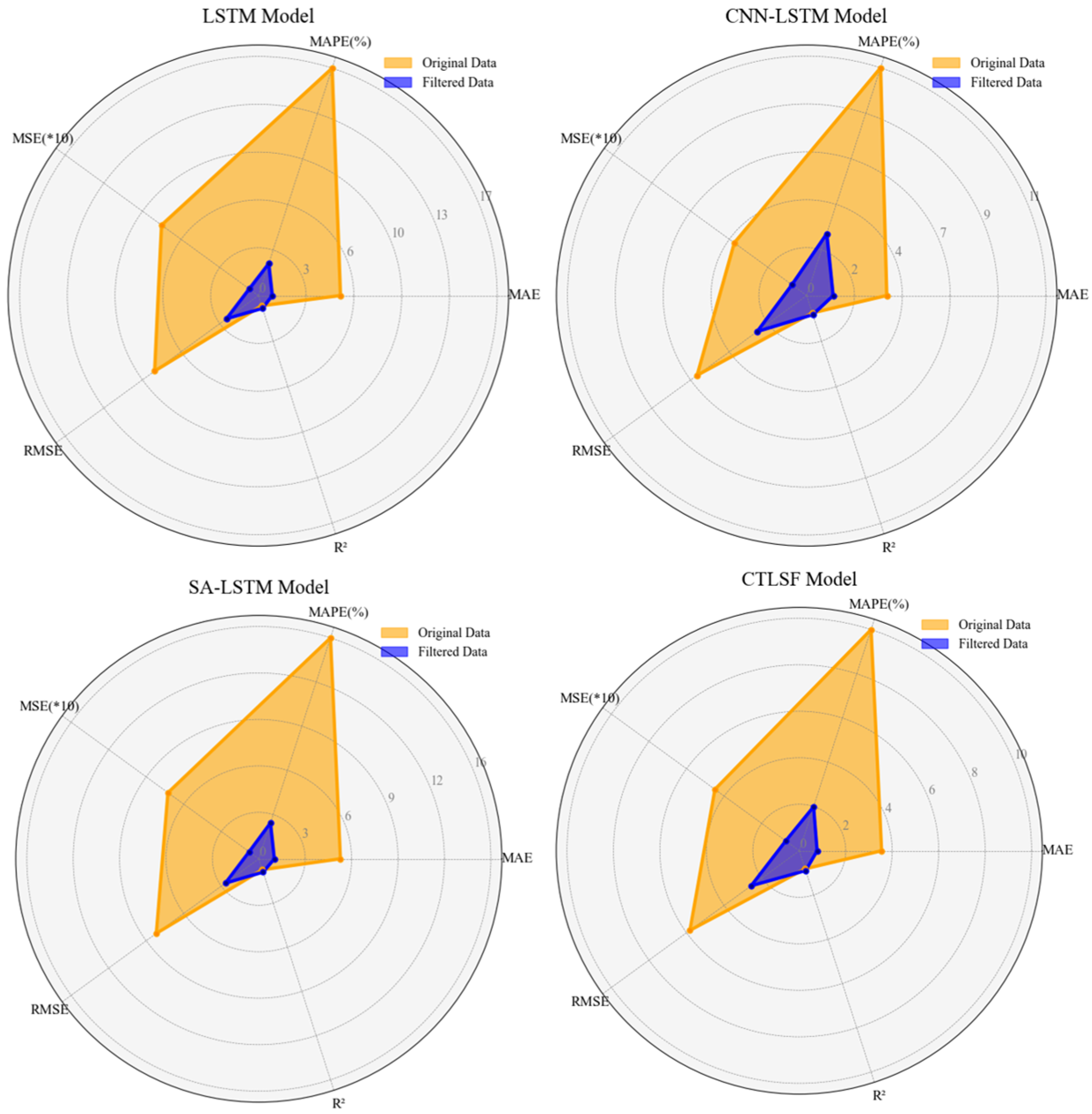 Figure 16. Each model is evaluated based on the five aforementioned metrics, with the orange area representing the model’s performance on the raw noisy data, and the purple area reflecting the model’s performance on the filtered data. From the four subplots, it is clearly evident that the area of the purple region is significantly smaller than that of the orange region. This indicates that data preprocessing, parameter correlation analysis, and subnetwork partitioning play crucial roles in enhancing the model’s performance, effectively improving its ability to perform well on filtered data. Among all models, the CTLSF model performed the best, demonstrating its stronger modeling capabilities for complex time series data. In contrast, the LSTM and CNN-LSTM models had higher errors on unfiltered data and were significantly affected by noise in the raw data. Although SA-LSTM showed some improvement over traditional LSTM, it still fell short of CTLSF in terms of overall performance across all metrics. It is important to note here that