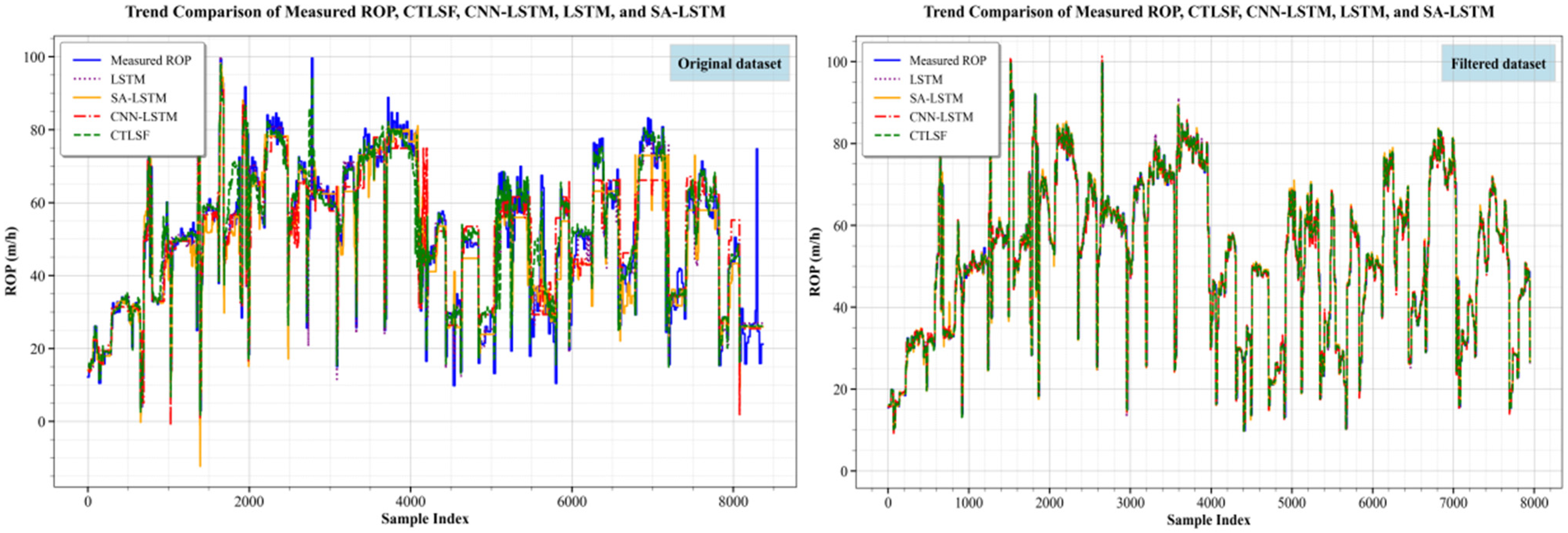 Under the influence of noise in the raw dataset, the predictive accuracy of the data-driven model was significantly lower than that observed in the filtered dataset. This phenomenon is primarily due to the presence of outliers and large fluctuations in the raw data, which conventional prediction models find challenging to adapt to the complex drilling process and extreme conditions. As shown in