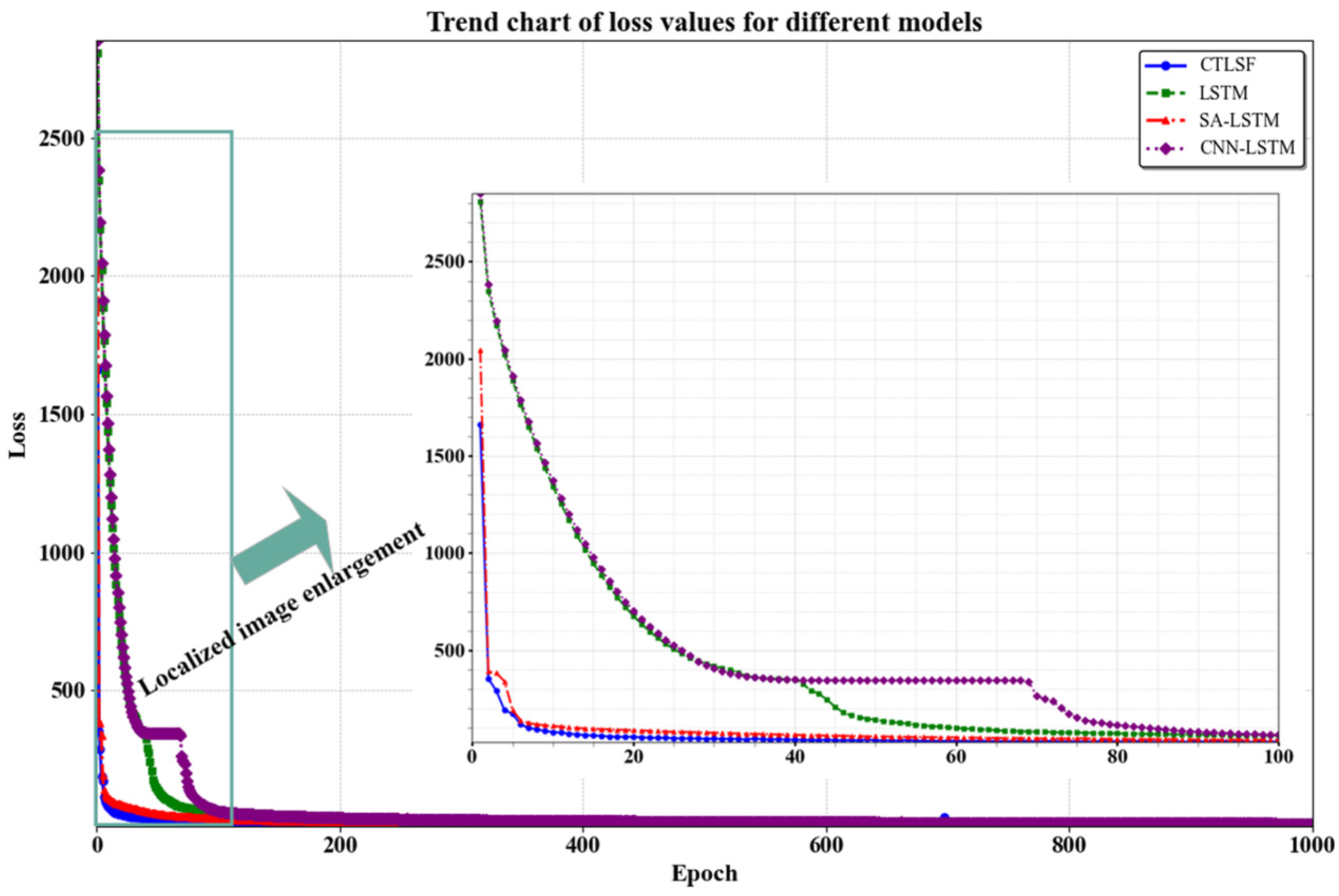 Figure 18, after more than 1000 epochs of iteration, the performance of all models tends to stabilize, and the loss value per iteration reaches a steady state. However, upon closer inspection of the first 100 epochs, significant differences in the loss reduction trends among the models can be observed. Specifically, the initial loss value of the CTLSF model is notably lower than that of other models, and it exhibits a faster decline in loss, eventually stabilizing with a superior performance. In contrast, models such as LSTM start with a higher initial loss, exhibit a slower reduction rate, and display some fluctuations during subsequent iterations. In conclusion, it can be seen in