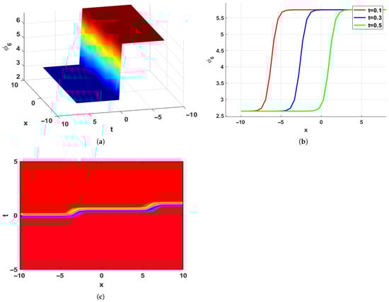 Visualization of the solution , displaying kink type solitons under the parameter value , , , , and . (a) 3D Plot. (b) 2D Plot. (c) Contour Plot.