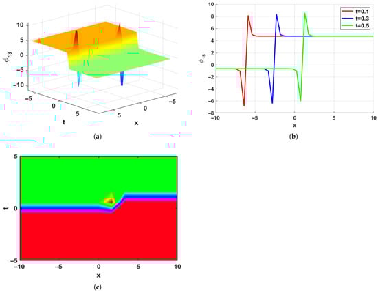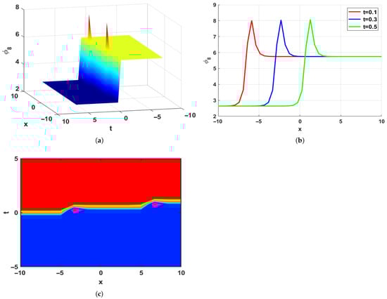 - (Step 5): Upon substituting Equations (7) and (8) into Equation (6) and setting the coefficients of to zero, a solvable system of algebraic equations for is obtained. The system is solved using Maple. By substituting the resulting values together with Equation (8) and the wave transformation into Equation (1), the corresponding analytical solutions of Equation (1) are obtained.