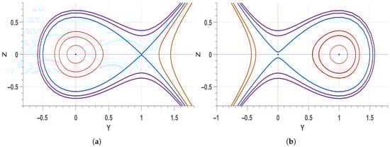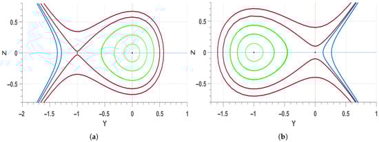 A bifurcation is a qualitative shift in the behavior of the trajectories that happens when the system parameters are modified in a differential equation system. By letting in Equation (13), the associated planar system can be formulated as follows: