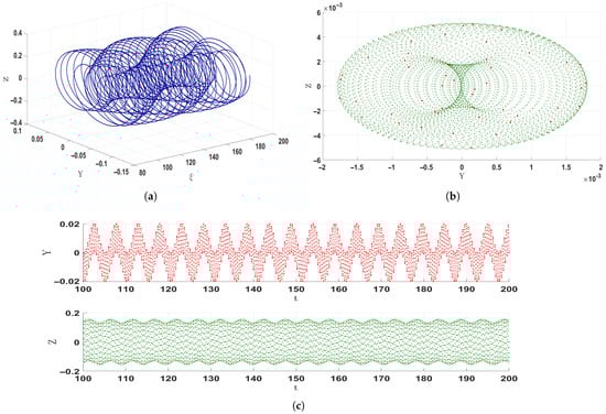 Visualization of chaotic dynamics in system Equation (31): (a) three-dimensional phase portrait, (b) two-dimensional projection with the Poincaré section presented in red, and (c) time series graph. The analysis is based on the parameter set: , , , and .