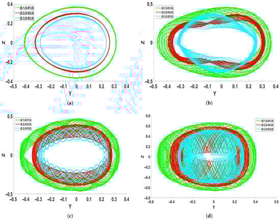 The green, red, and cyan trajectories in Figure 10a exhibit periodic motion, creating smooth closed loops that signify steady oscillations. The motion becomes quasi-periodic in Figure 10b, indicating increased sensitivity to initial conditions and parameters. Figure 10c,d show chaotic behavior, where the unpredictable nature of chaos is revealed by overlapping and densely packed paths. These findings demonstrate the rich multistability of nonlinear dynamics by demonstrating how slight modifications to initial values or parameters can change the system’s evolution.