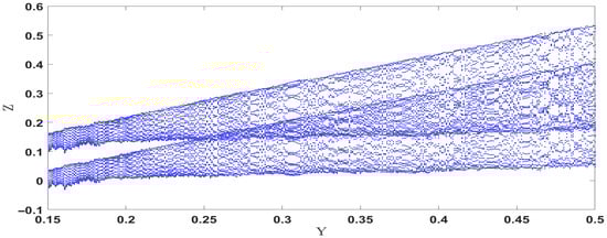 A bifurcation diagram shows how the dynamics of a dynamical system evolve as a control parameter is changed. In a perturbed plane system, the parameter usually denotes the magnitude of the perturbation. By looking at the bifurcation diagram, various dynamical regimes like steady states, periodic oscillations (limit cycles), and chaotic motion can be determined. Figure 15 presents the bifurcation diagram of the perturbed system Equation (31), plotted as Y versus Z with the parameters , , , and . The diagram exhibits irregular and complex patterns, indicating the presence of chaotic dynamics.