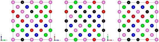 Based on the results of steady-state phase structure analysis, an atom distribution model was constructed, and structural optimization calculations were carried out for the AlCrFeMoTi HEA with a BCC phase structure. Based on the site preference of atoms occupying sublattices [], a 4 × 4 × 4 type B2-NiAl supercell (128 atomic sites, 64 1a/1b sublattices each) was used to construct the atom distribution model of AlCrFeMoTi HEA. The results indicate that the alloying atom has an obvious site preference. Fe, Mo, and Cr atoms tend to prefer being located in the 1a sublattice, while Al and Ti atoms tend to prefer being located in the 1b sublattice. This is consistent with the calculation results in Figure 3. At 973 K, the final configuration is (Al5Cr16Fe26Mo17Ti0)1a(Al21Cr9Fe0Mo9Ti25)1b, as shown in Figure 6.