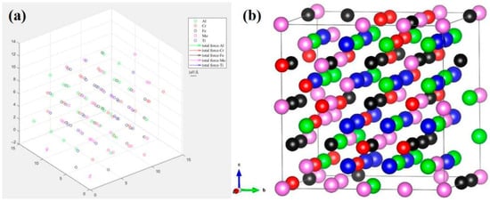 (a) Atomic distribution, (b) steady-state structure after complete relaxation of AlCrFeMoTi HEA.